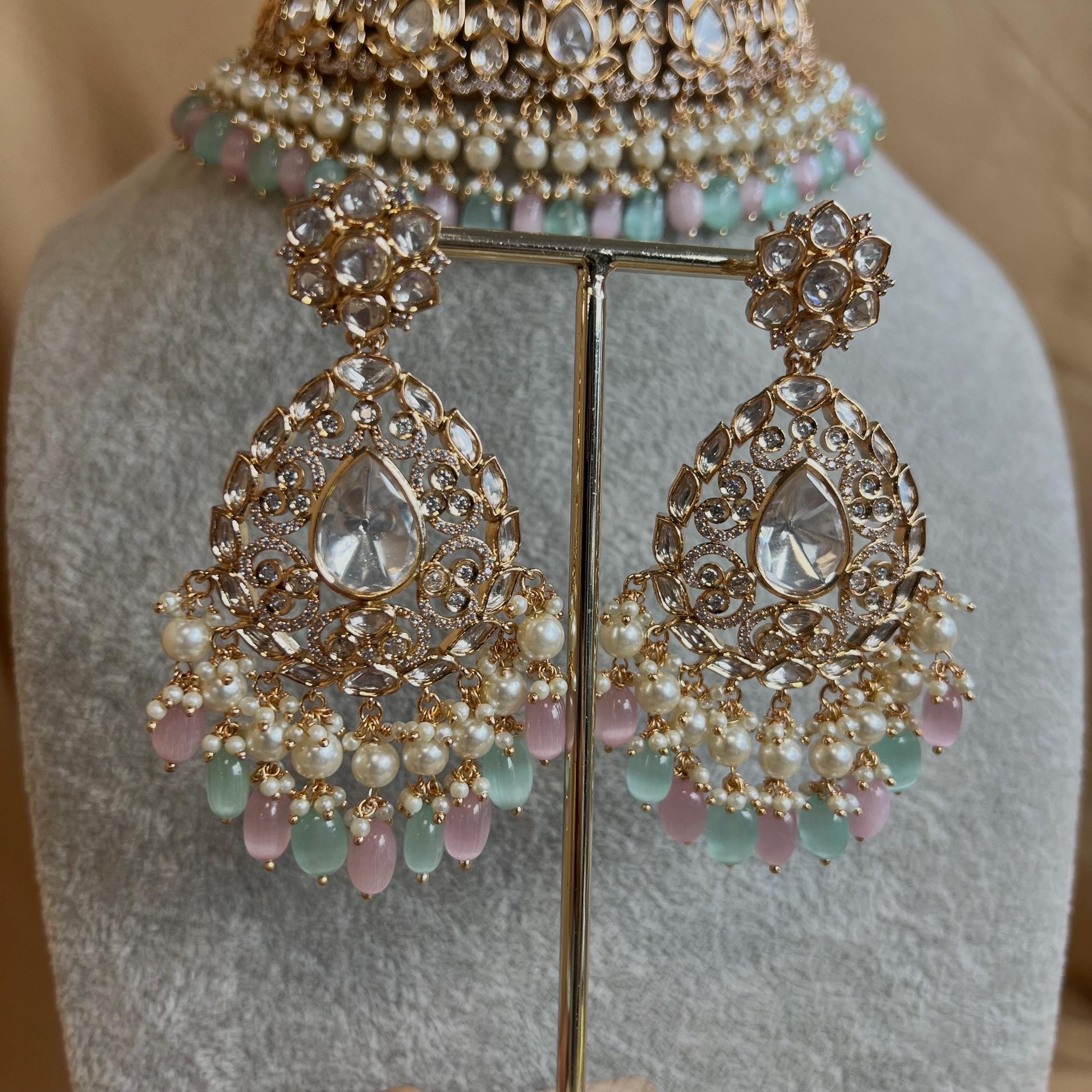 This gorgeous pastels gold plated Kundan choker set includes matching large earrings & tikka.