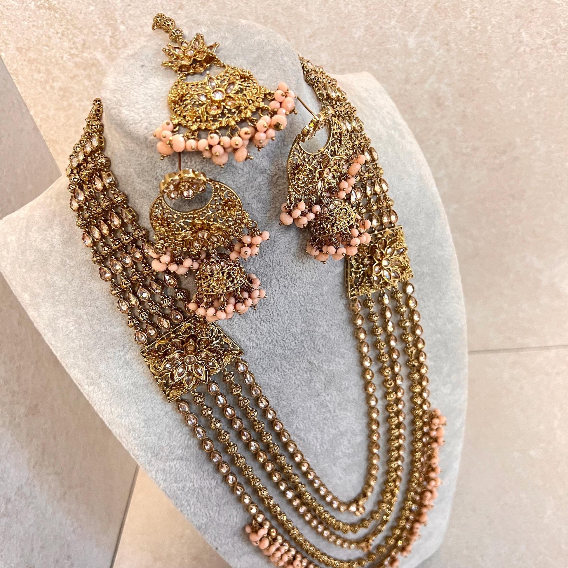 Peach Gold 4 piece Antique Gold Champagne Zircon Long Mala Necklace Jhumka Earring Tikka High Quality Indian Pakistani Punjabi Style Gift