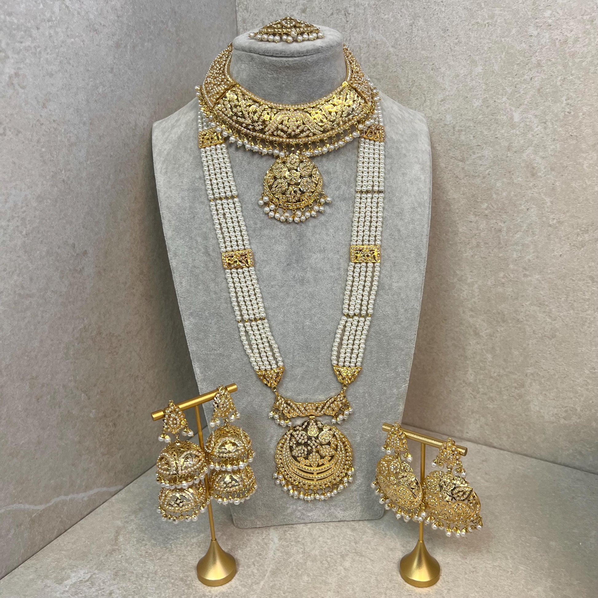 Pretty lightweight bright gold pearl choker with mala, choice of earring and tikka. Sparkling silver rhinestones.