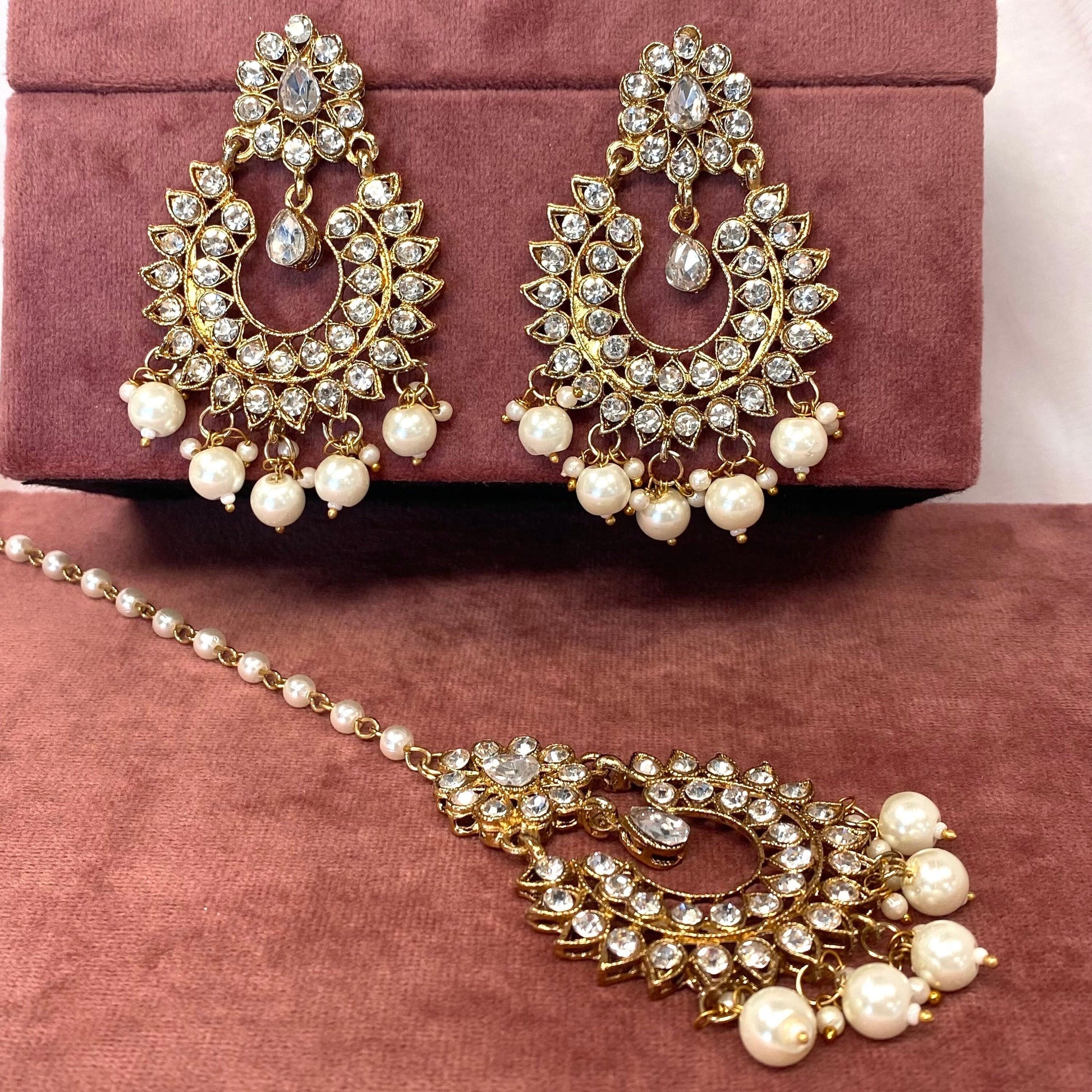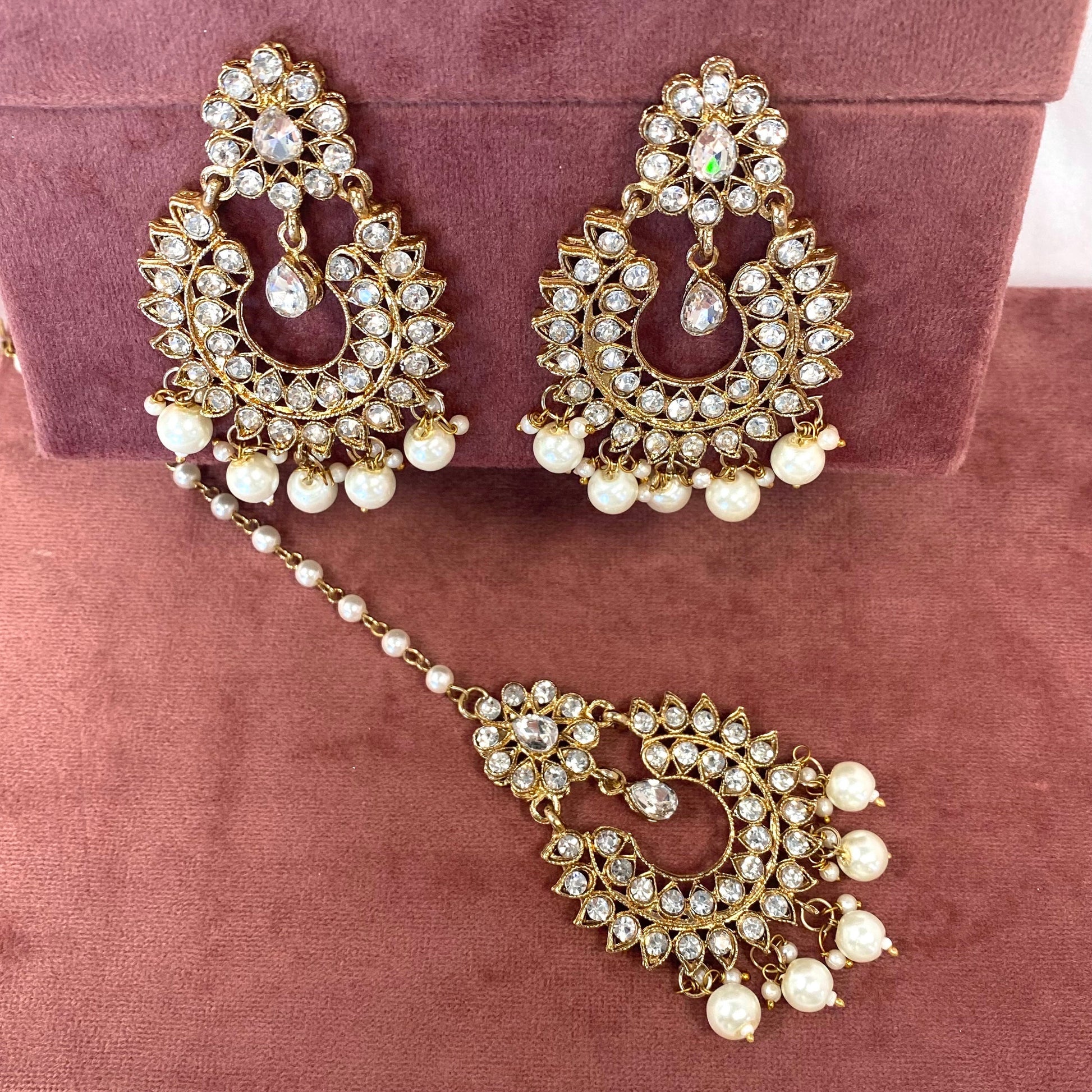 This gorgeous pearl large earrings comes with a tikkaAntique gold base with silver rhinestones
