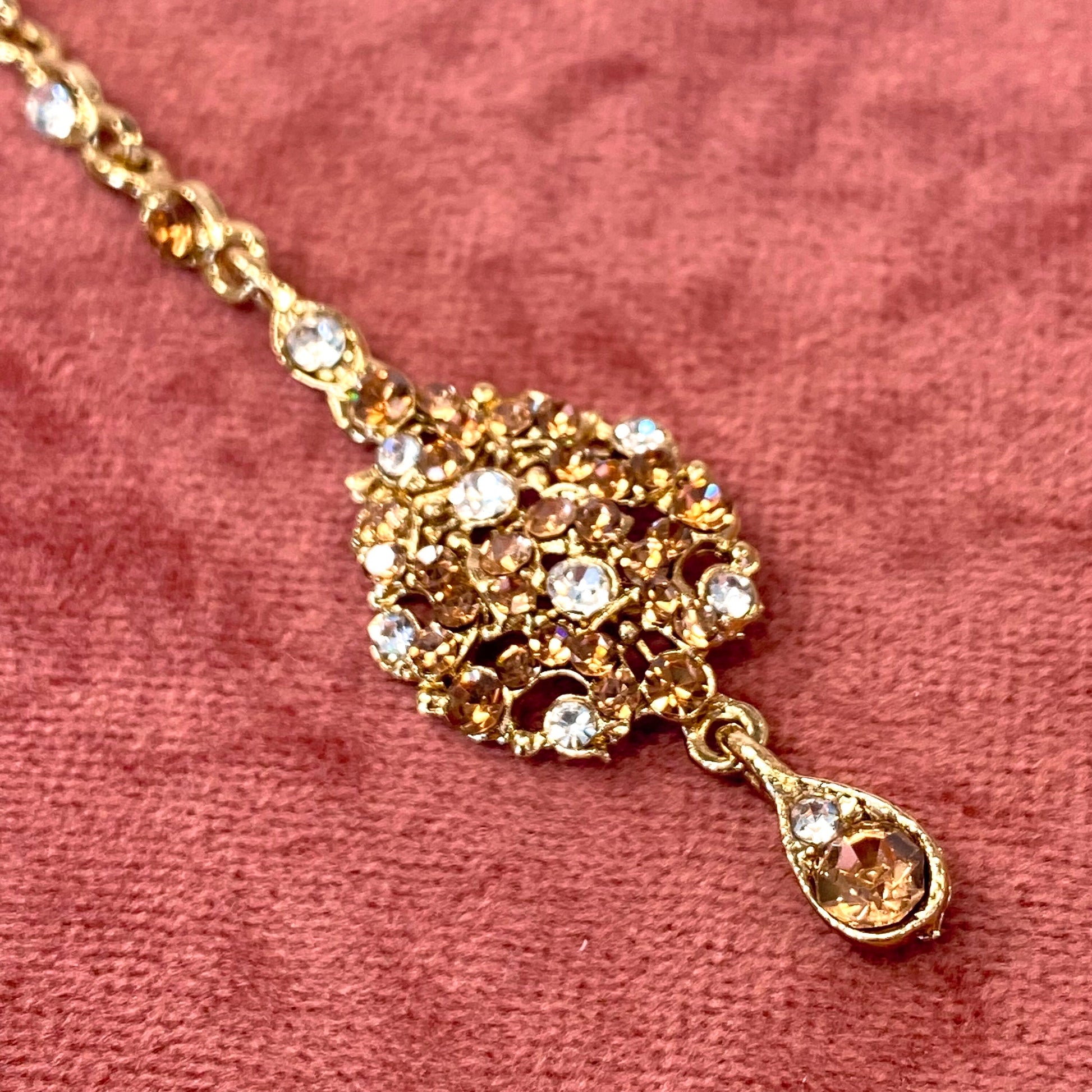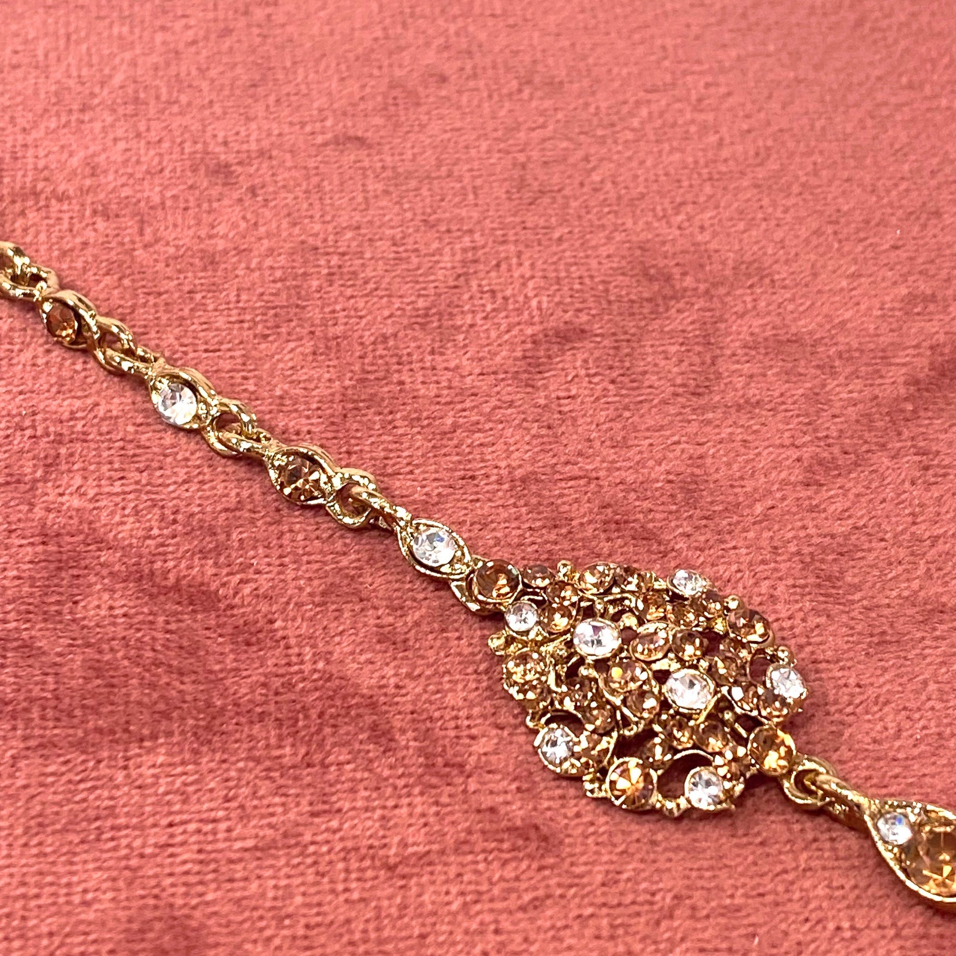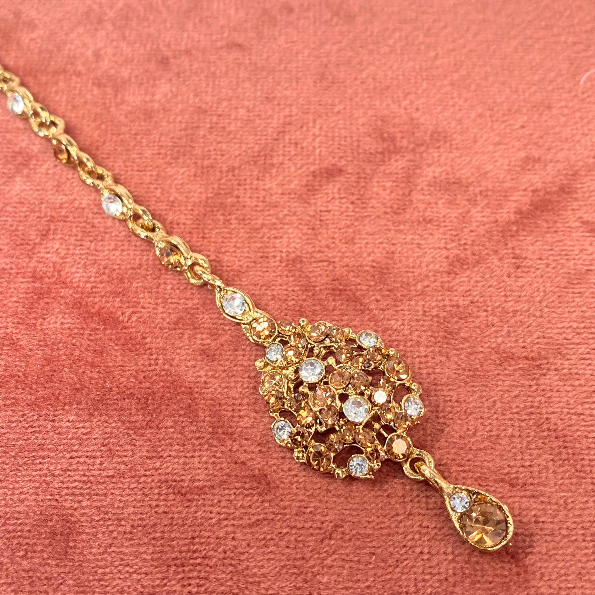 This petite piece is perfect if you want to opt out for smaller tikka look. Golden and silver rhinestones