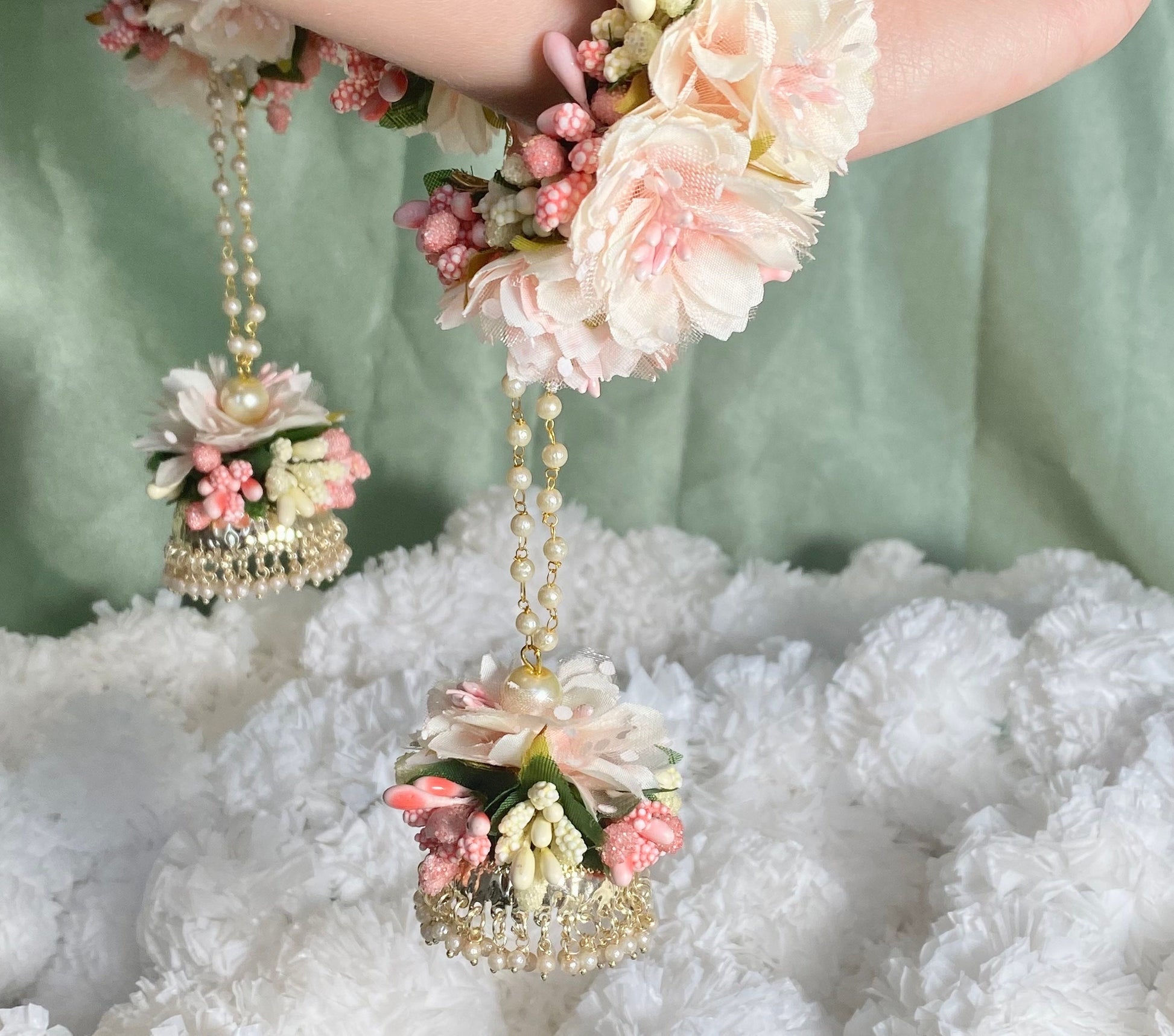 Set of 2 artificial floral bangles with attached kaleereh for bride to be worn on occasion of Haldi ceremony or baby shower ceremonies. Bangles are stretchable and the kaleereh complete the overal look!