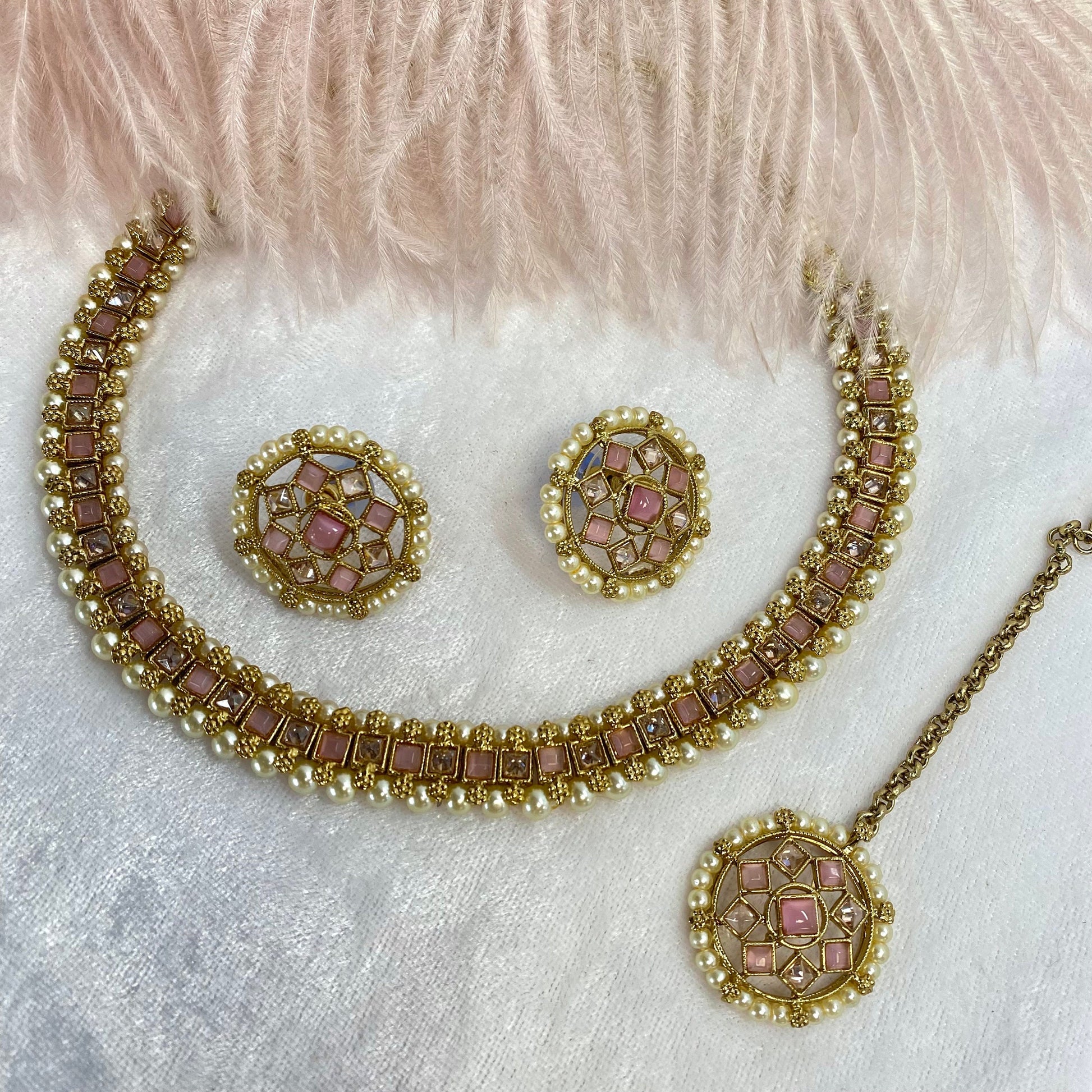 Pretty pink necklace set with earrings and tikka. Antique gold with pink stone and pearl detailing.