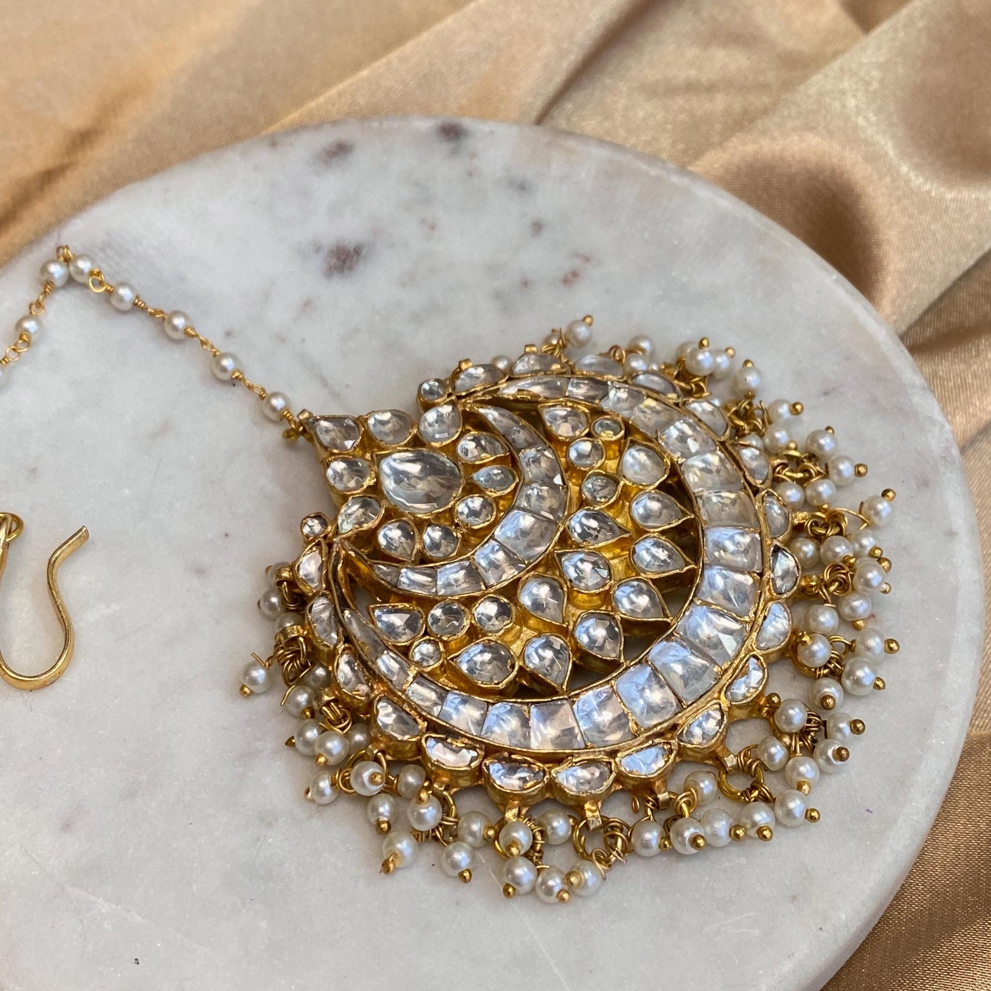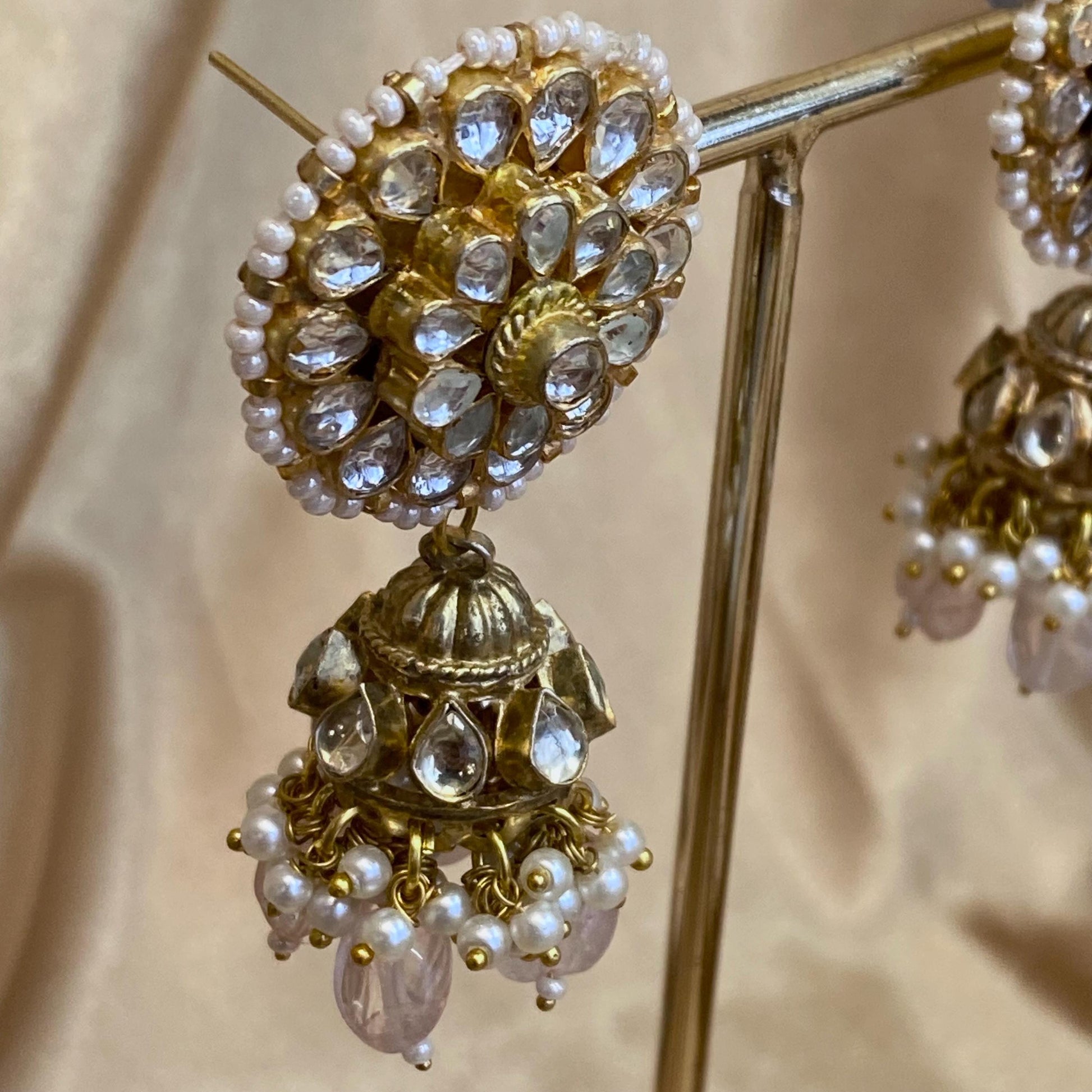 Luxurious bright gold plated real kundan, high quality pale pink quartz and intricate pearl work.