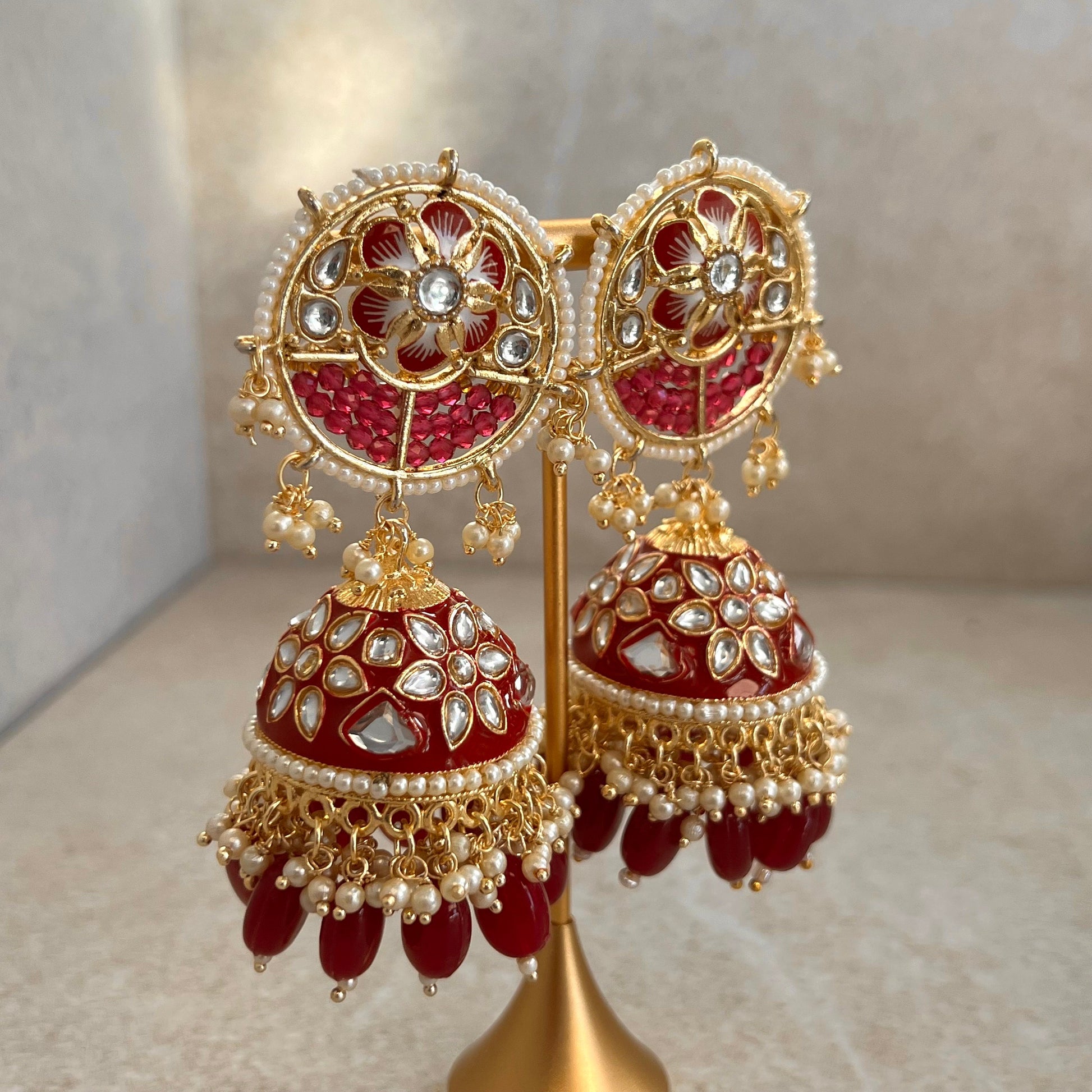 Light weight jhumka with floral meenakari paint work and tiny pearl bead work.
