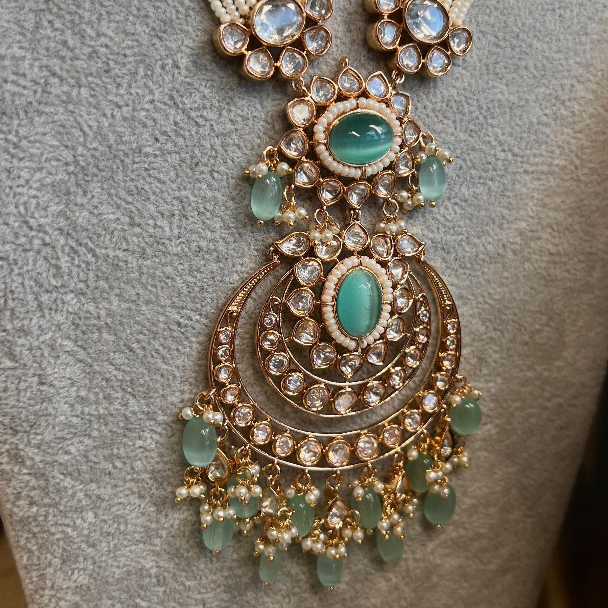 A unique style designed to stand out, Comes complete with a necklace, long mala, large earrings with chains that can be removed, sheeshphool with tikka can attach to and two beautiful hand harnesses that are easily adjustable. Gold base with clear stones and light mint ombre beads.