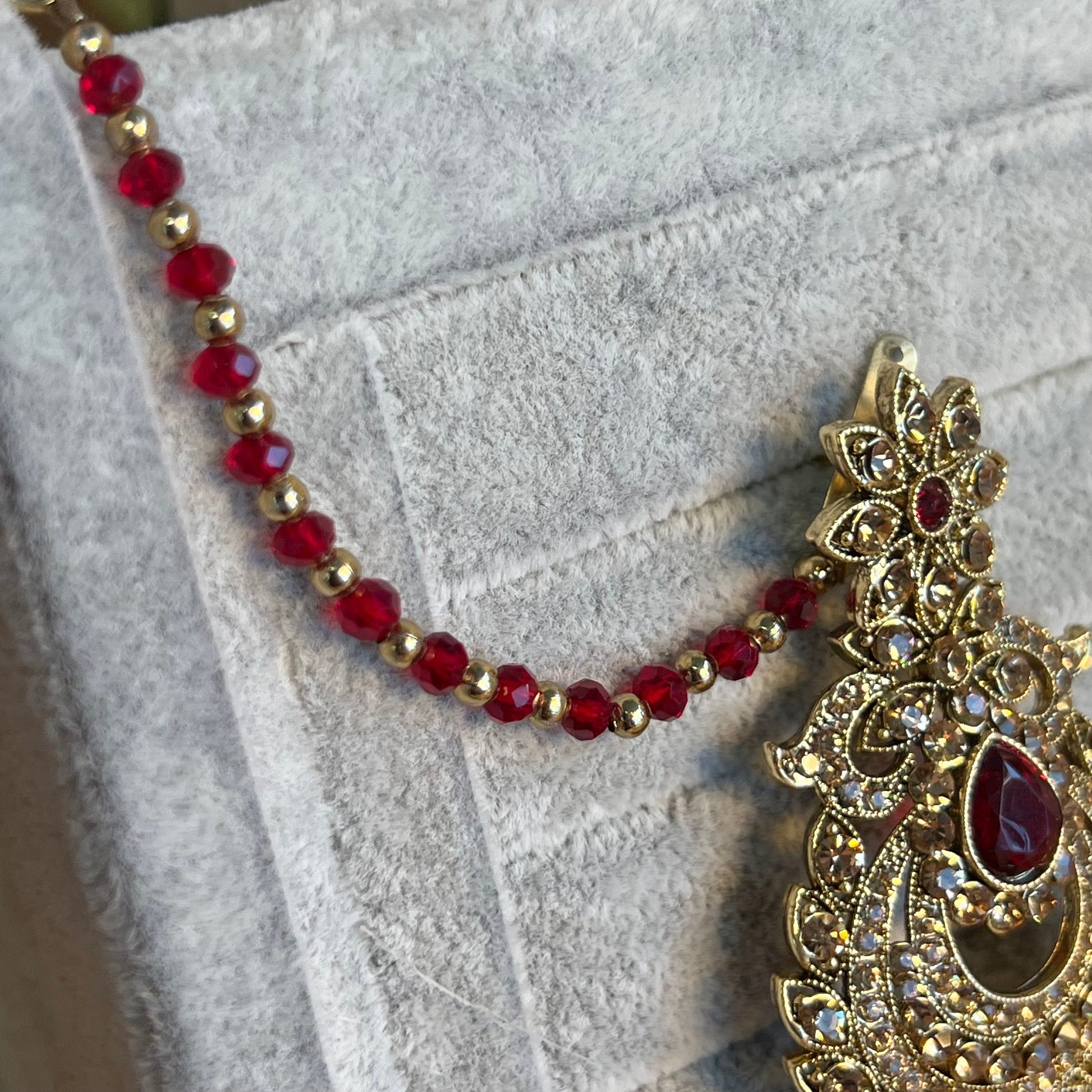 Antique gold base with golden rhinestones and red detailing