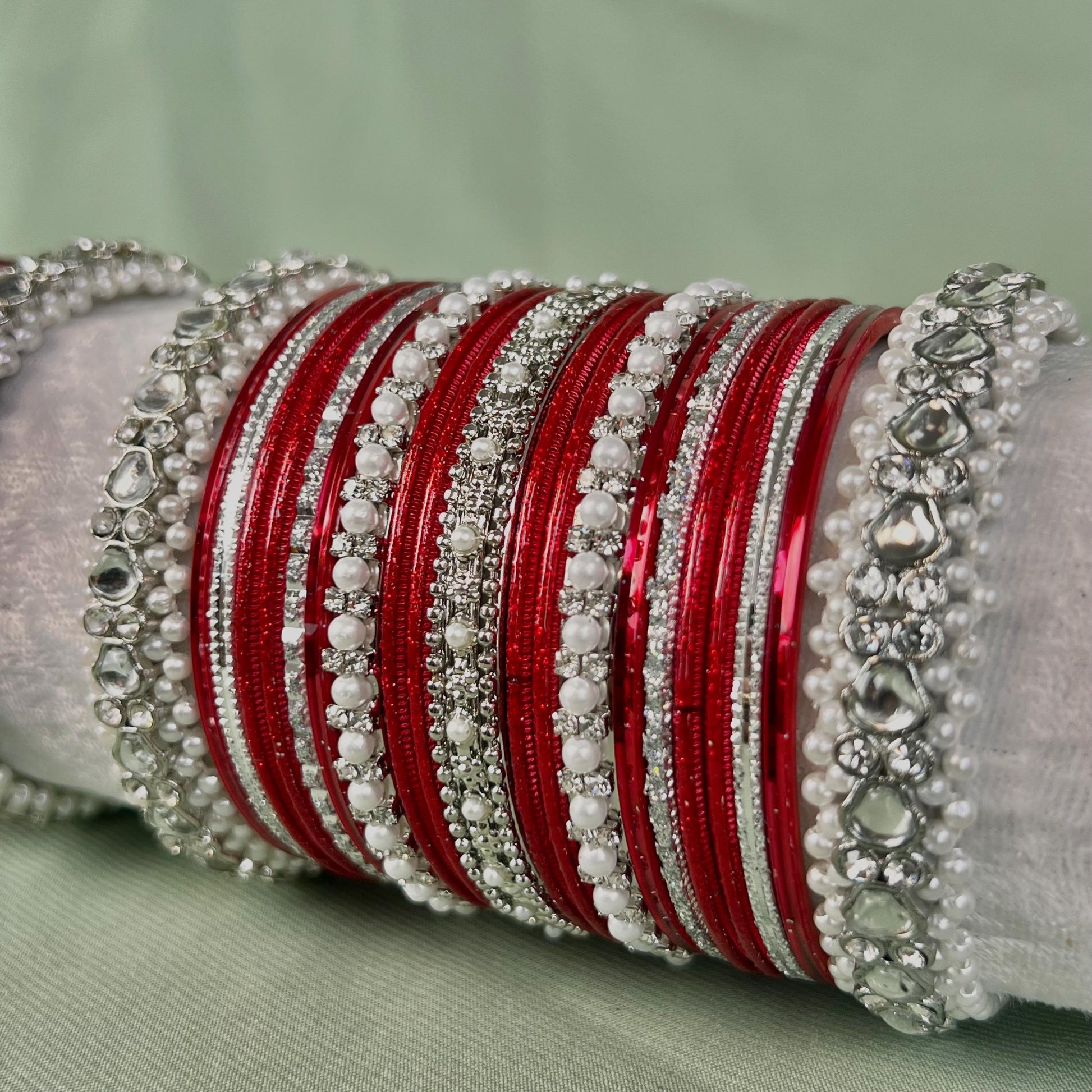 Priyanka Chopra wedding outfit inspire custom bangle set. This set includes silver faux kundan and pearly bangles mixed with red & silver metal bangles. This set is for both arms available in all sizes.