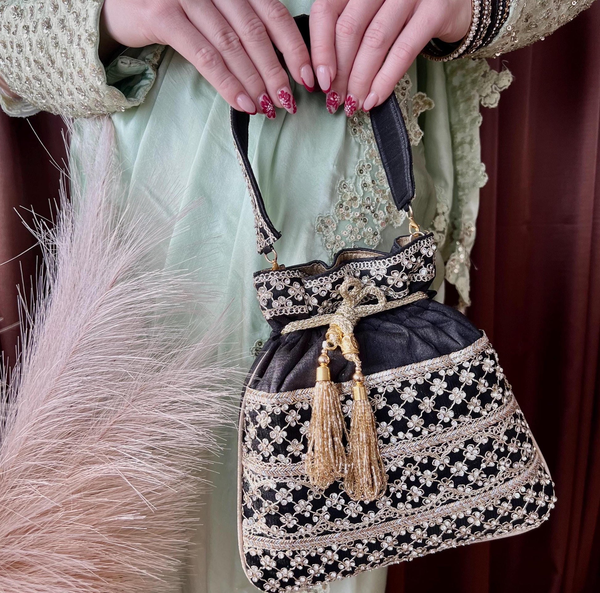 Sequin Detail Black Potli Bag/Indian Handmade Traditional Phulkari Potli Bags/Modern Ethnic Mirror Work Potli Bags/Red Bags