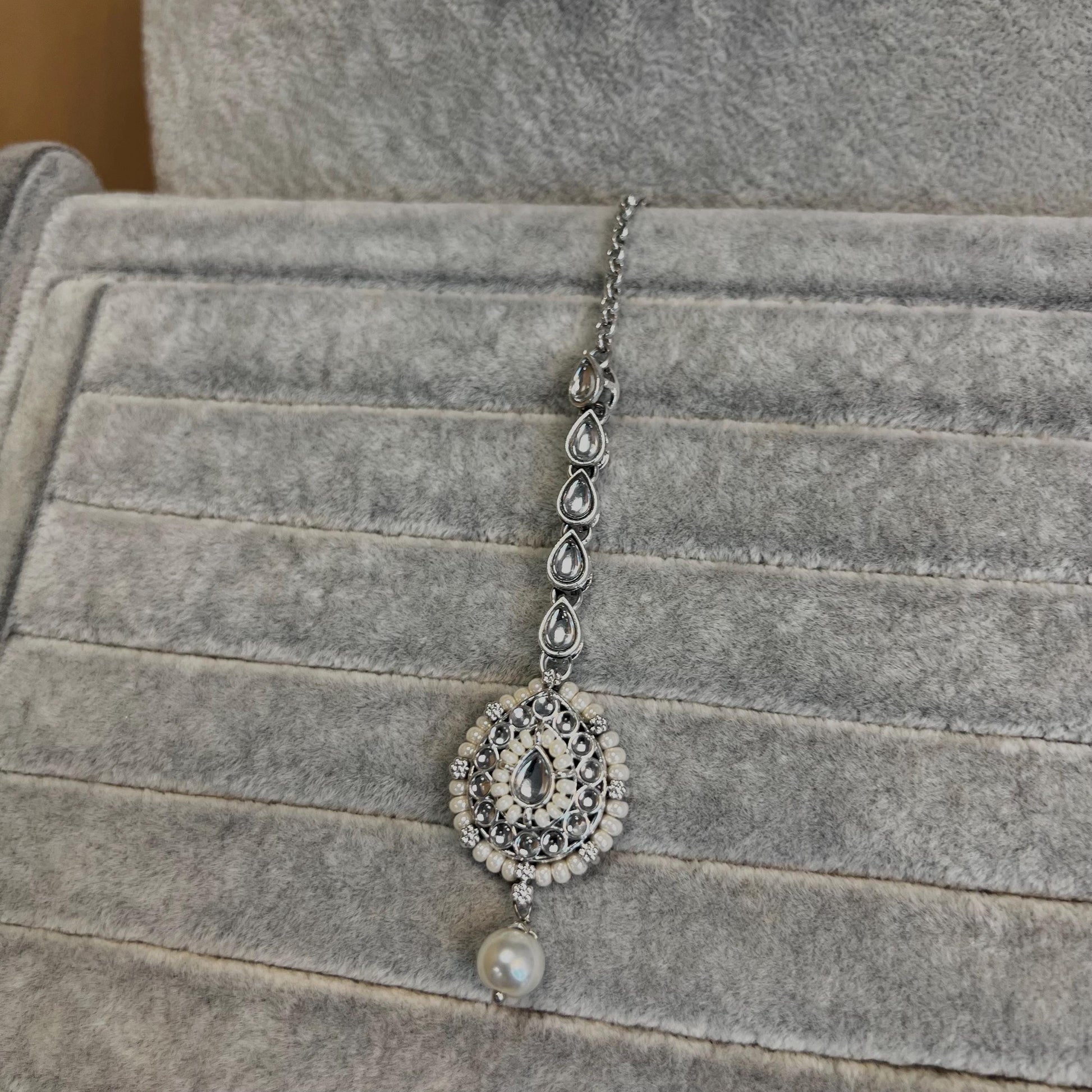 This gorgeous silver faux Kundan necklace comes with matching tikka only.