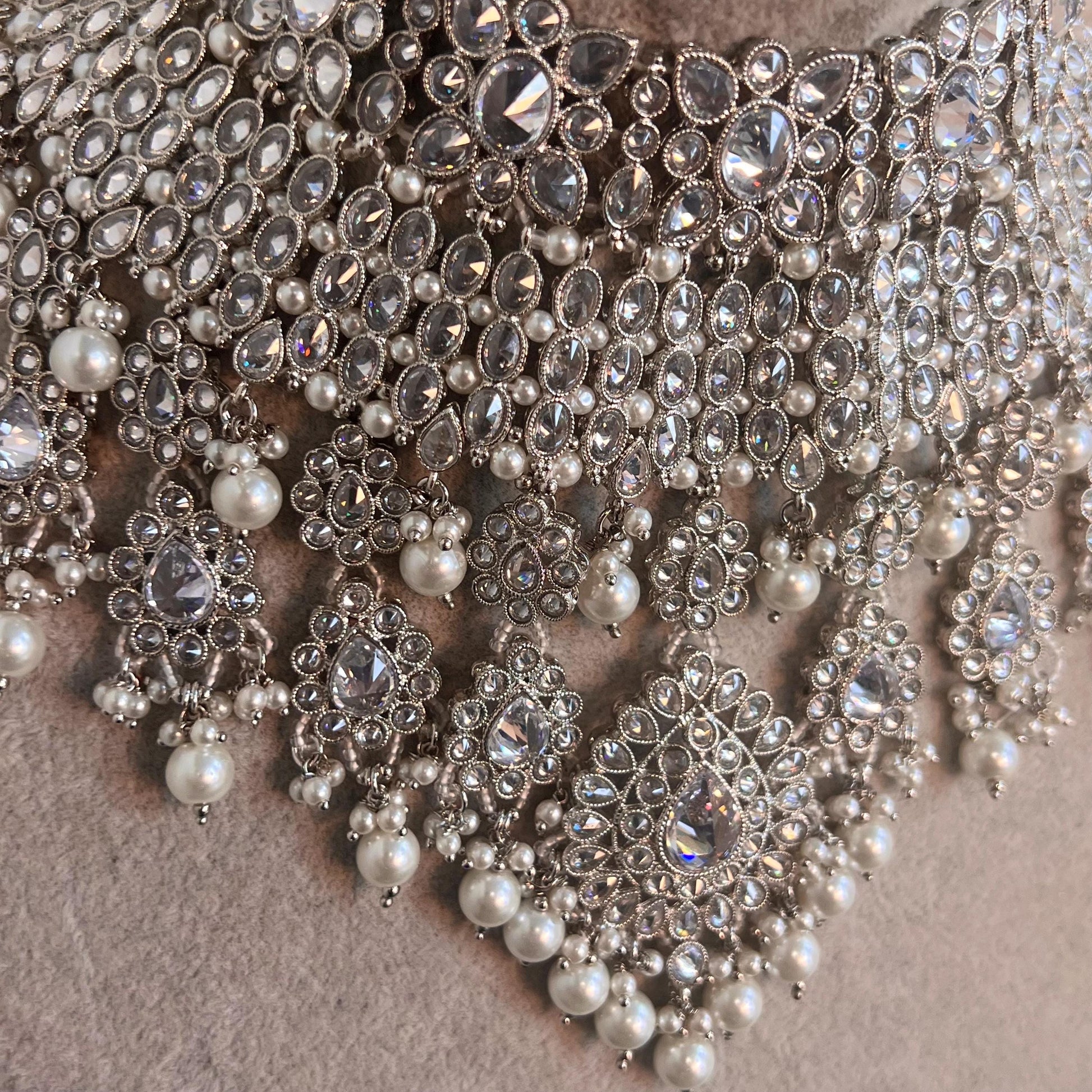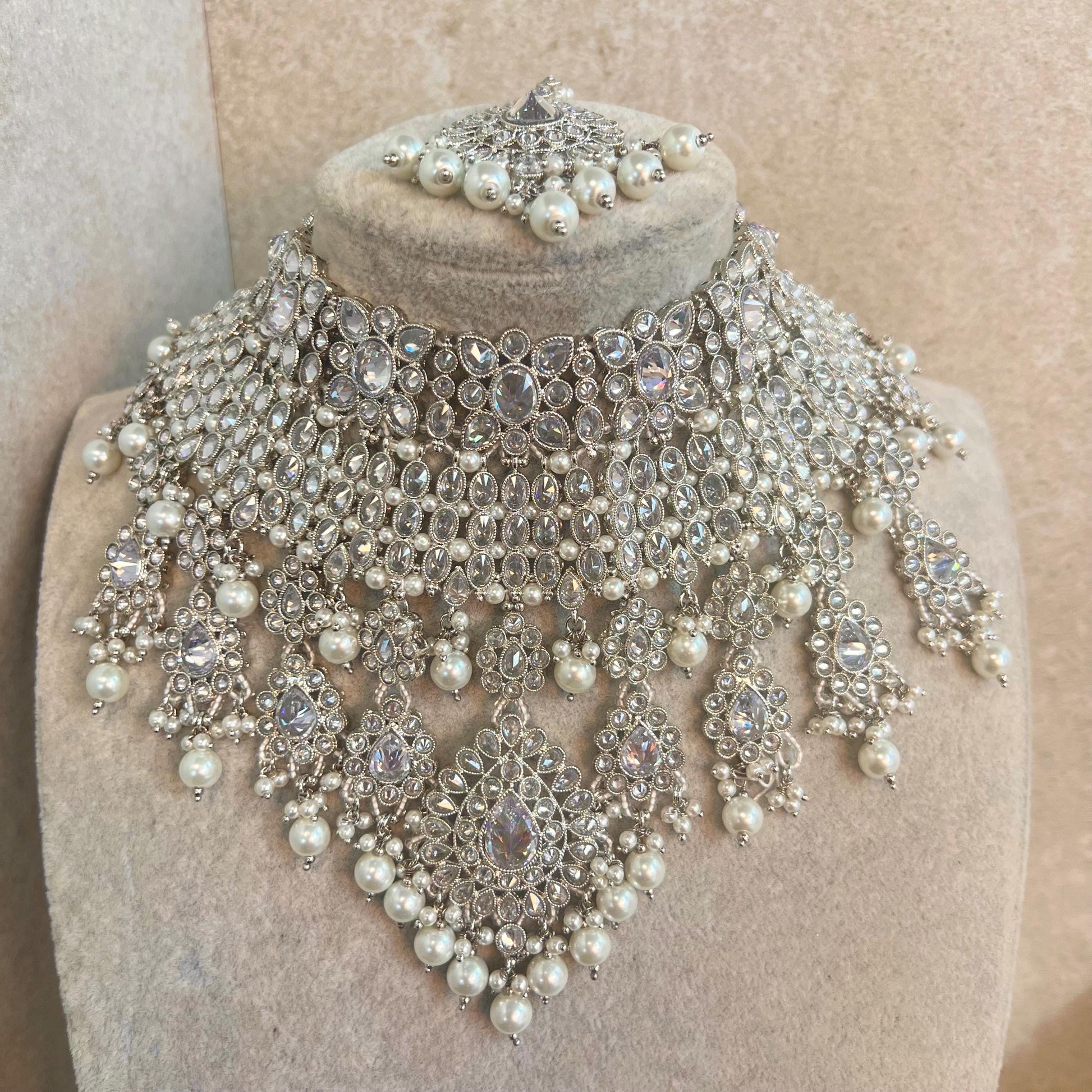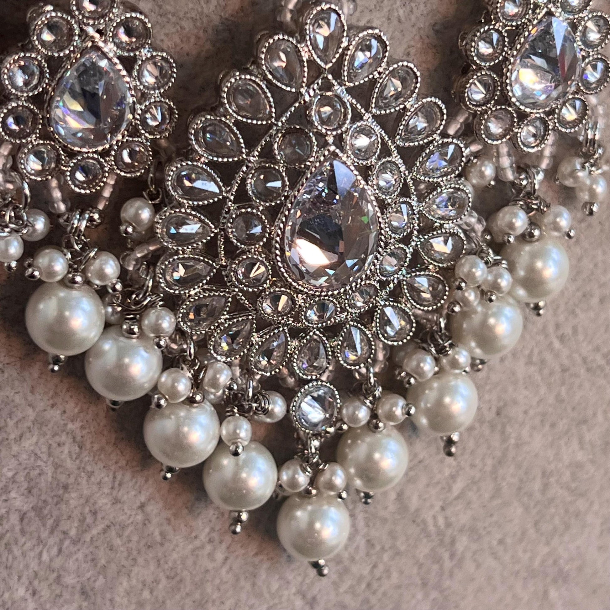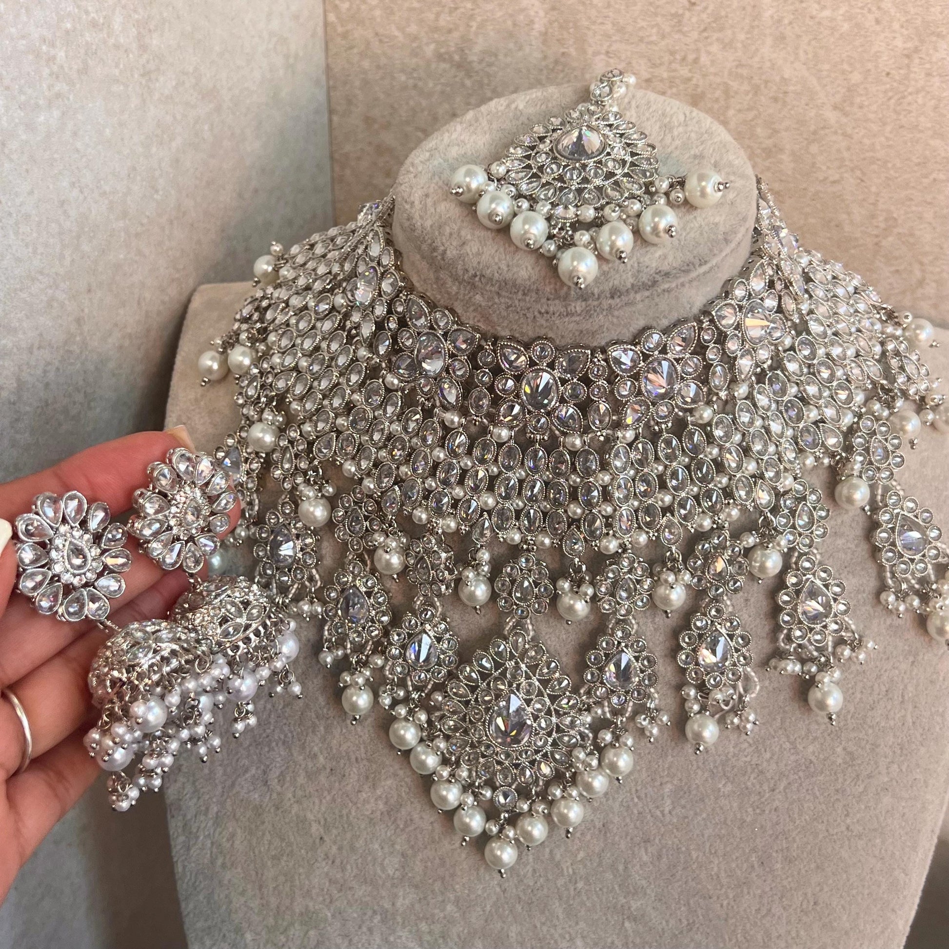 Silver Bridal Set - Pearl Indian/ Pakistani Style With Jhumka earring, Tikka/Tikli/ Heavy Set/ Wedding/ Fashion Jewellery/ Necklace set