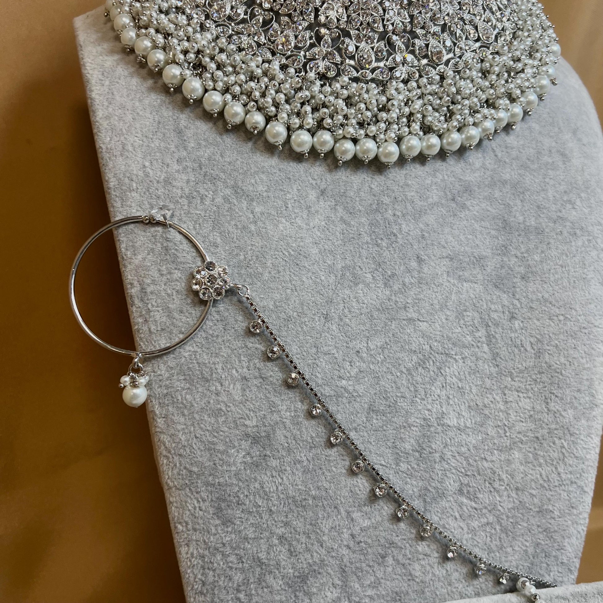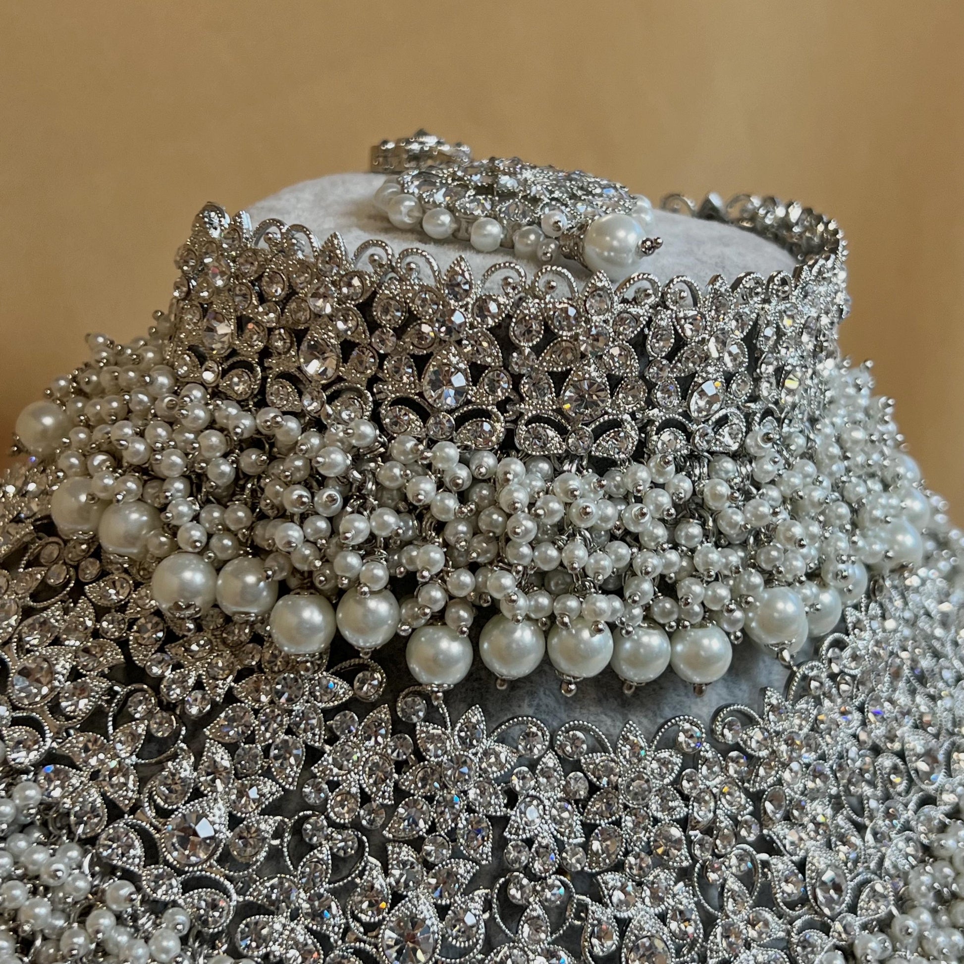 Full silver bridal set includes choker, necklace, jhumka earrings with attached earring and tikka.