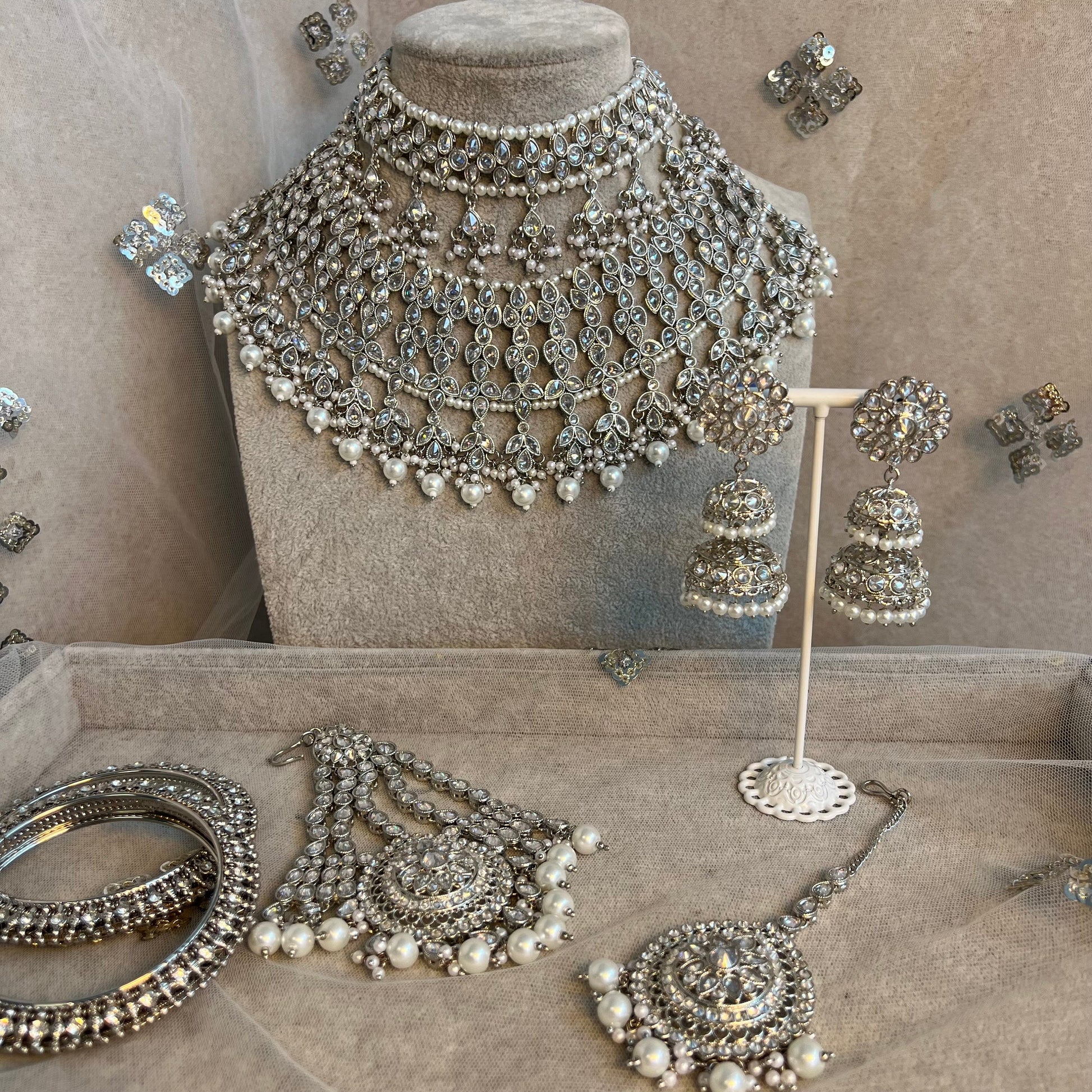 Silver Bridal Set - Pearl Indian/ Pakistani Style With Jhumka earring, Tikka/Tikli, Jhumar/jhoomar/ Wedding/ Fashion Jewellery/ Necklace set