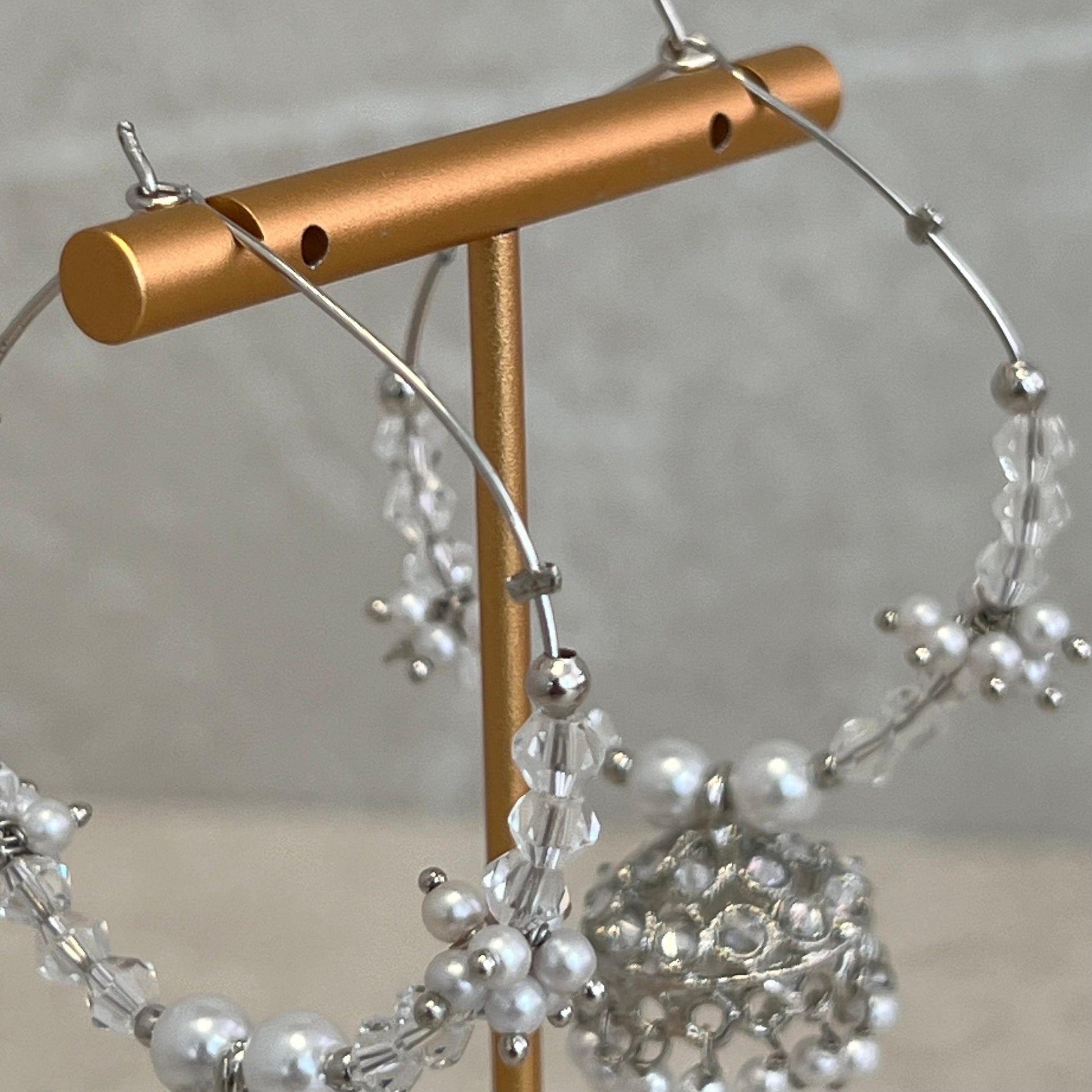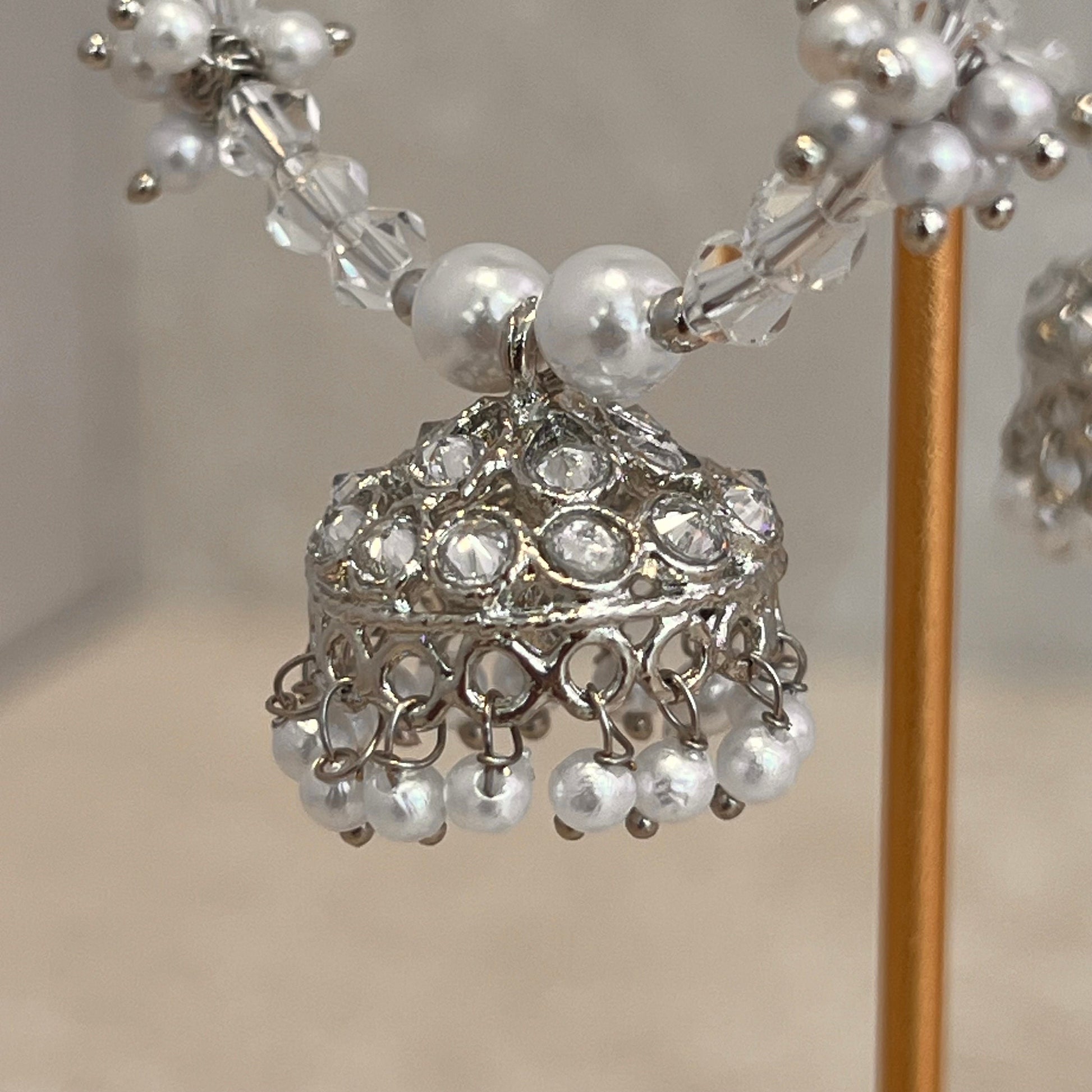 Handmade silver hoop earring with clear and white pearls and pretty jhumka made with zircon crystals