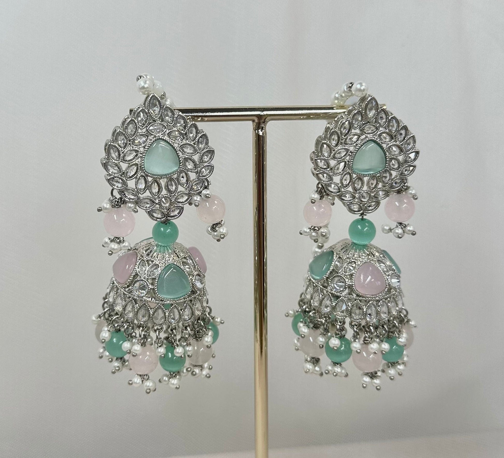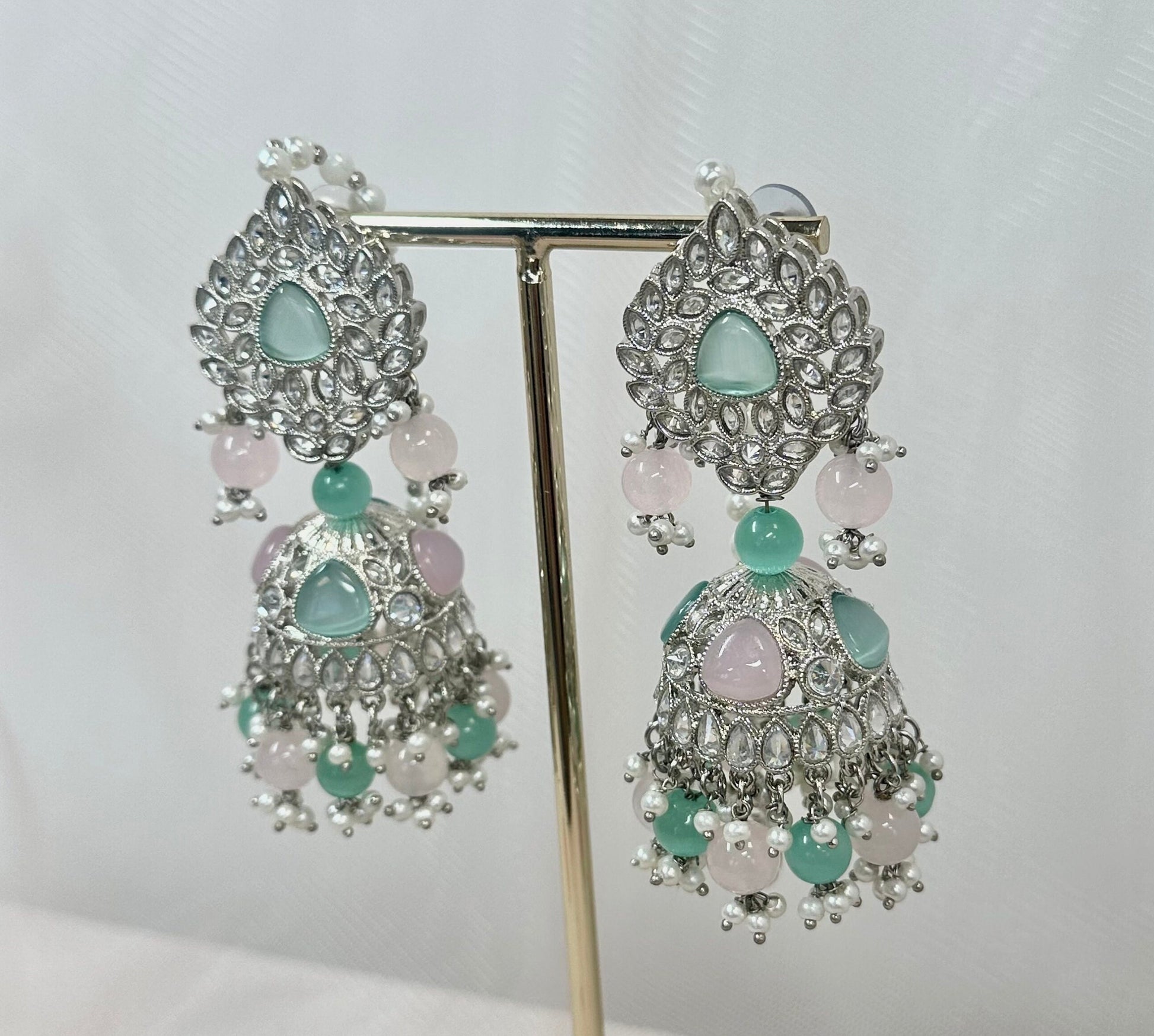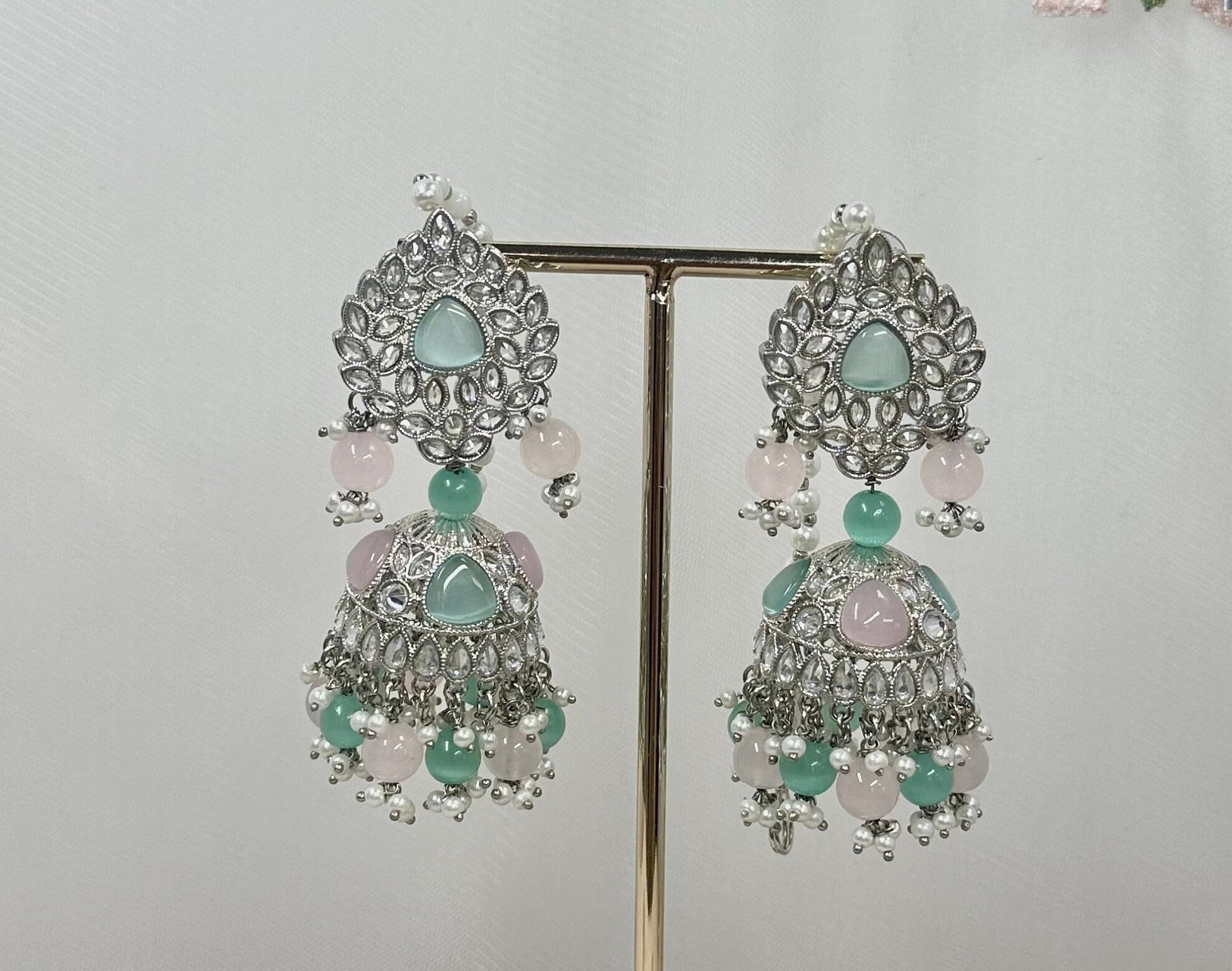 Silver Jhumka Earrings - Mint/Pink/ Indian Style Earring