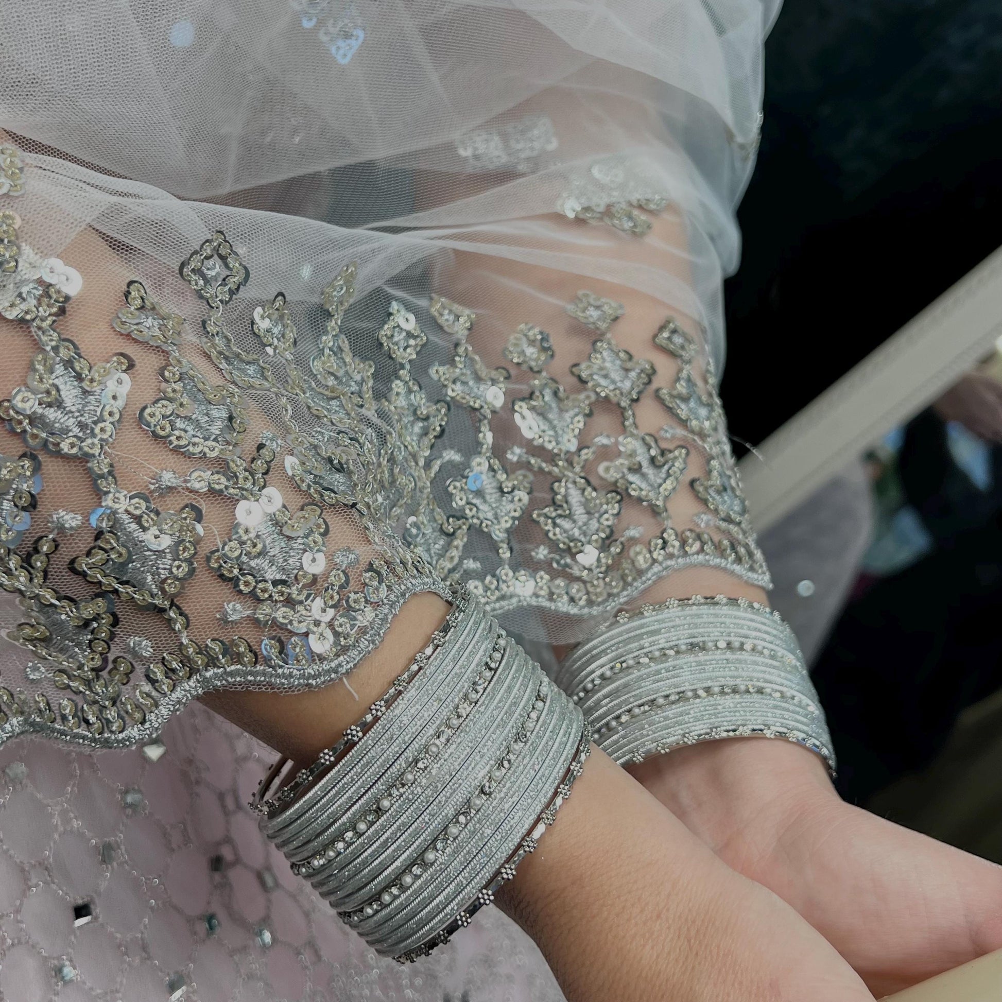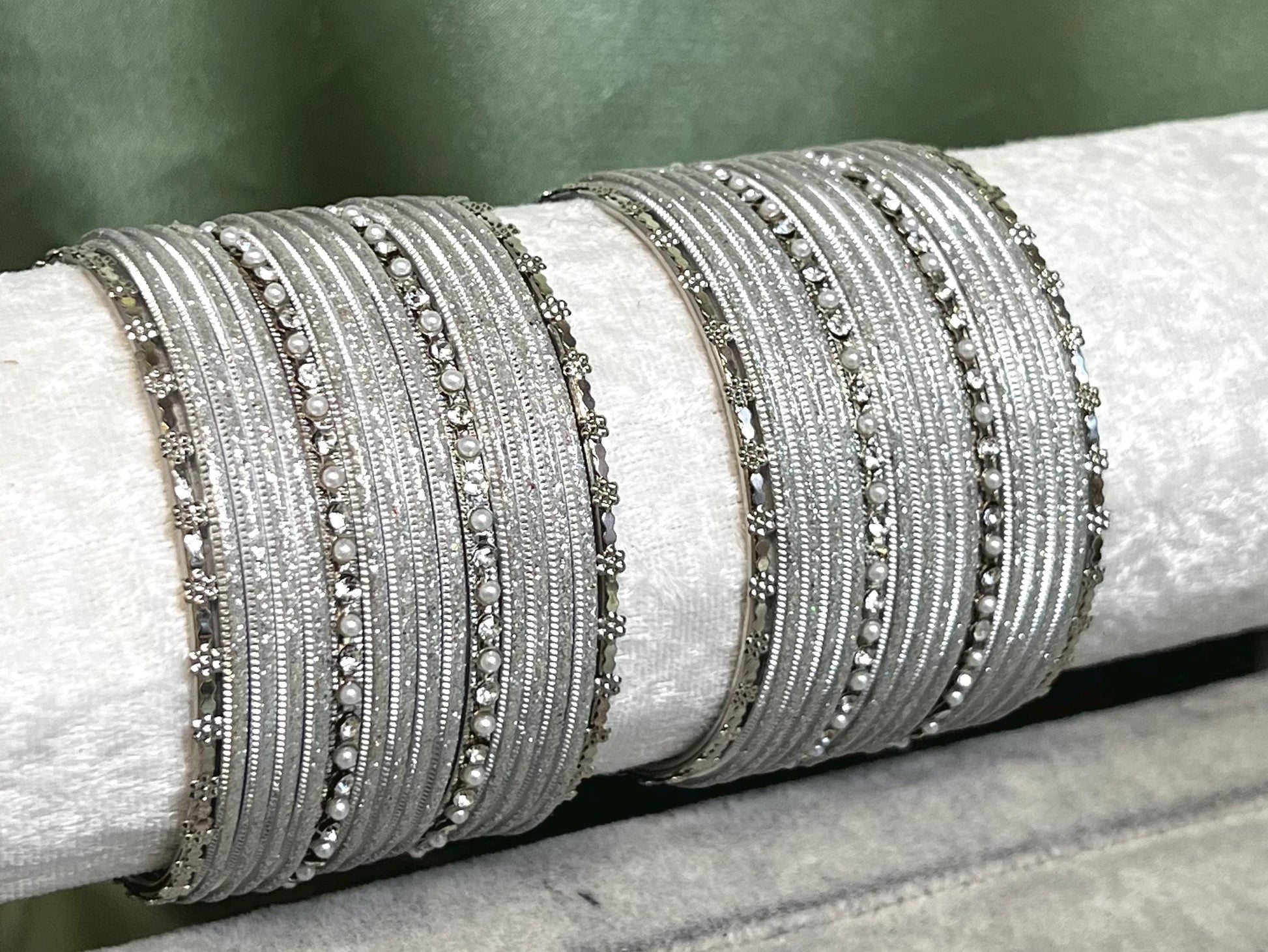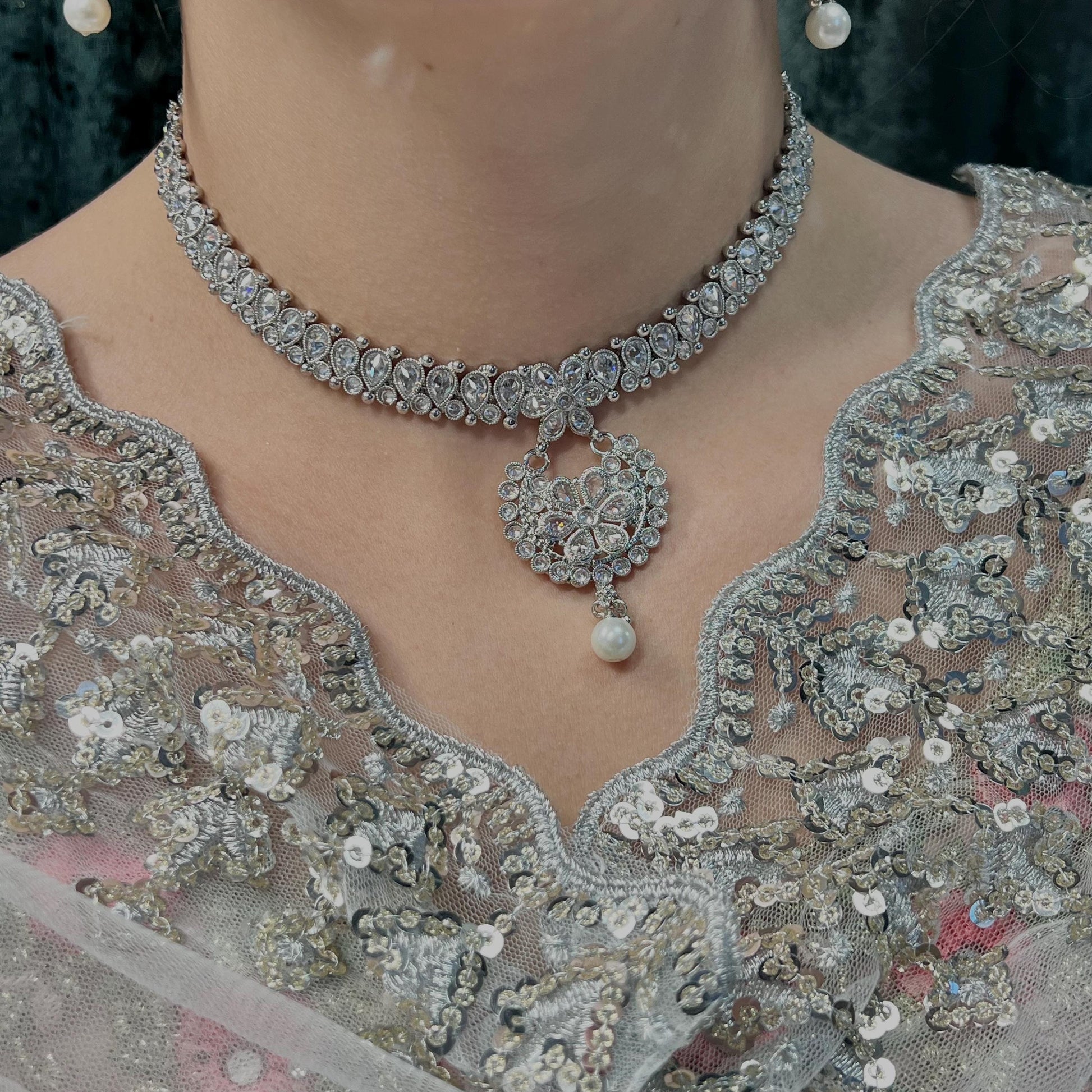 Silver necklace set includes matching earrings and tikka with a mini bangle set for both arms.