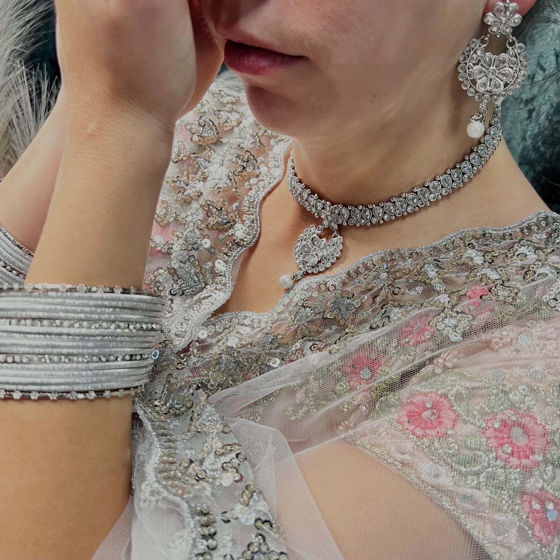 Silver necklace set includes matching earrings and tikka with a mini bangle set for both arms.