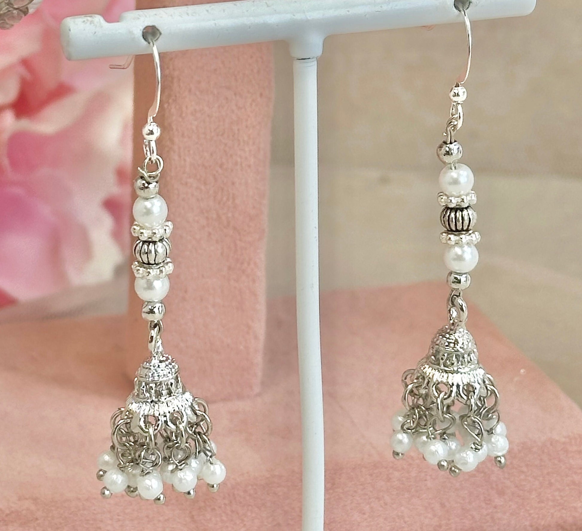 Includes a pair of this gorgeous light weight silver colour jhumka earrings with hook style back, approximately 6 inch length x 1.8 inch wide.