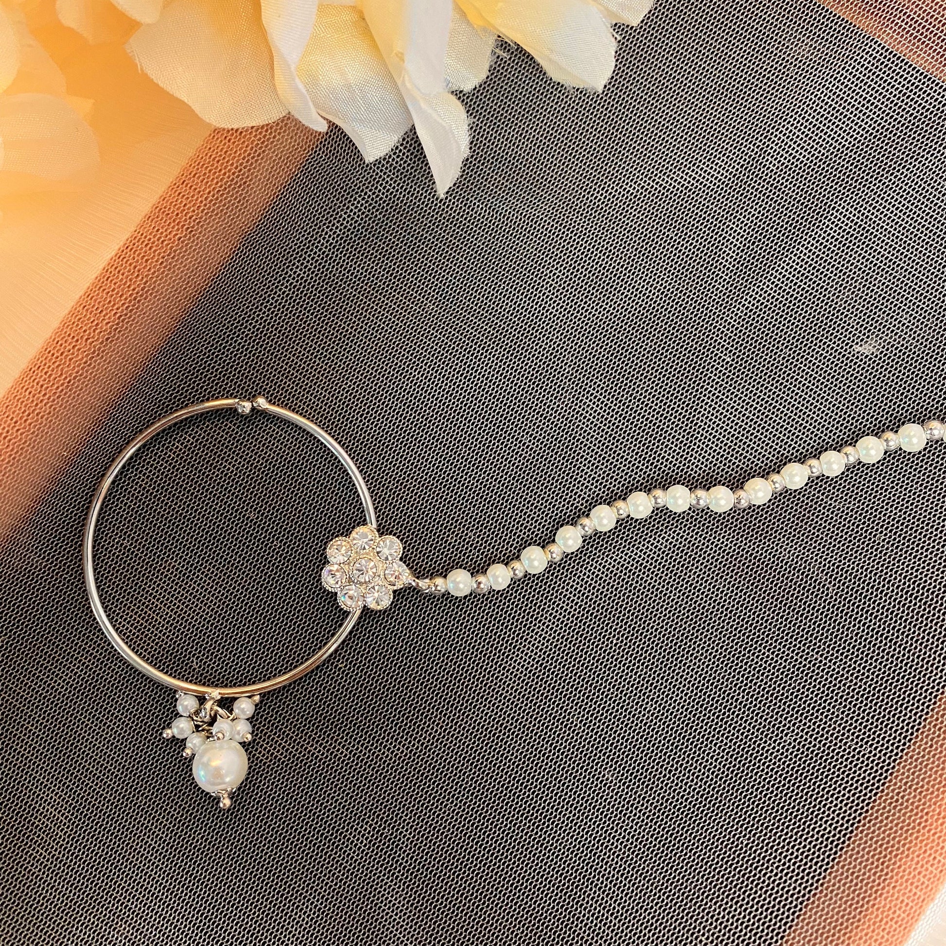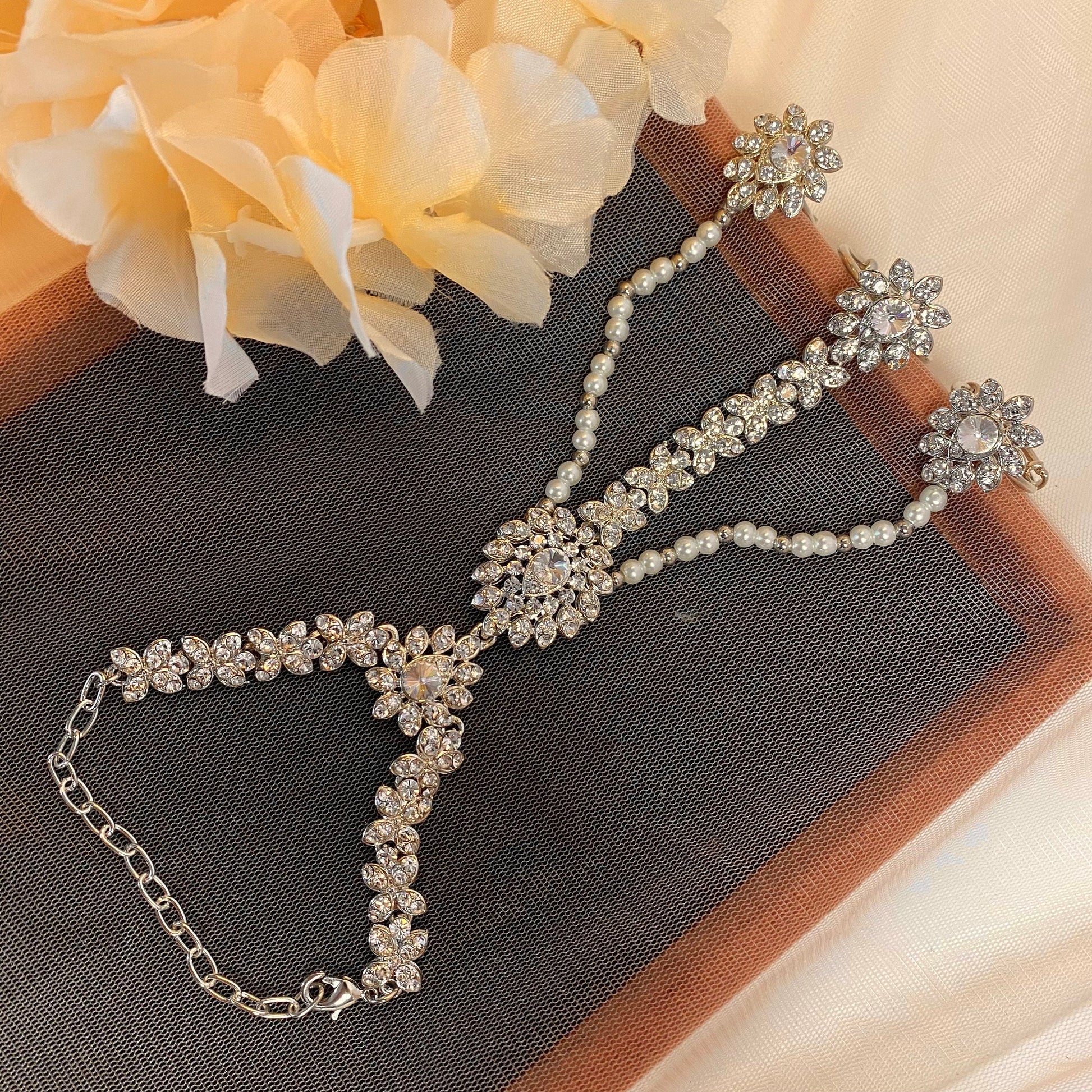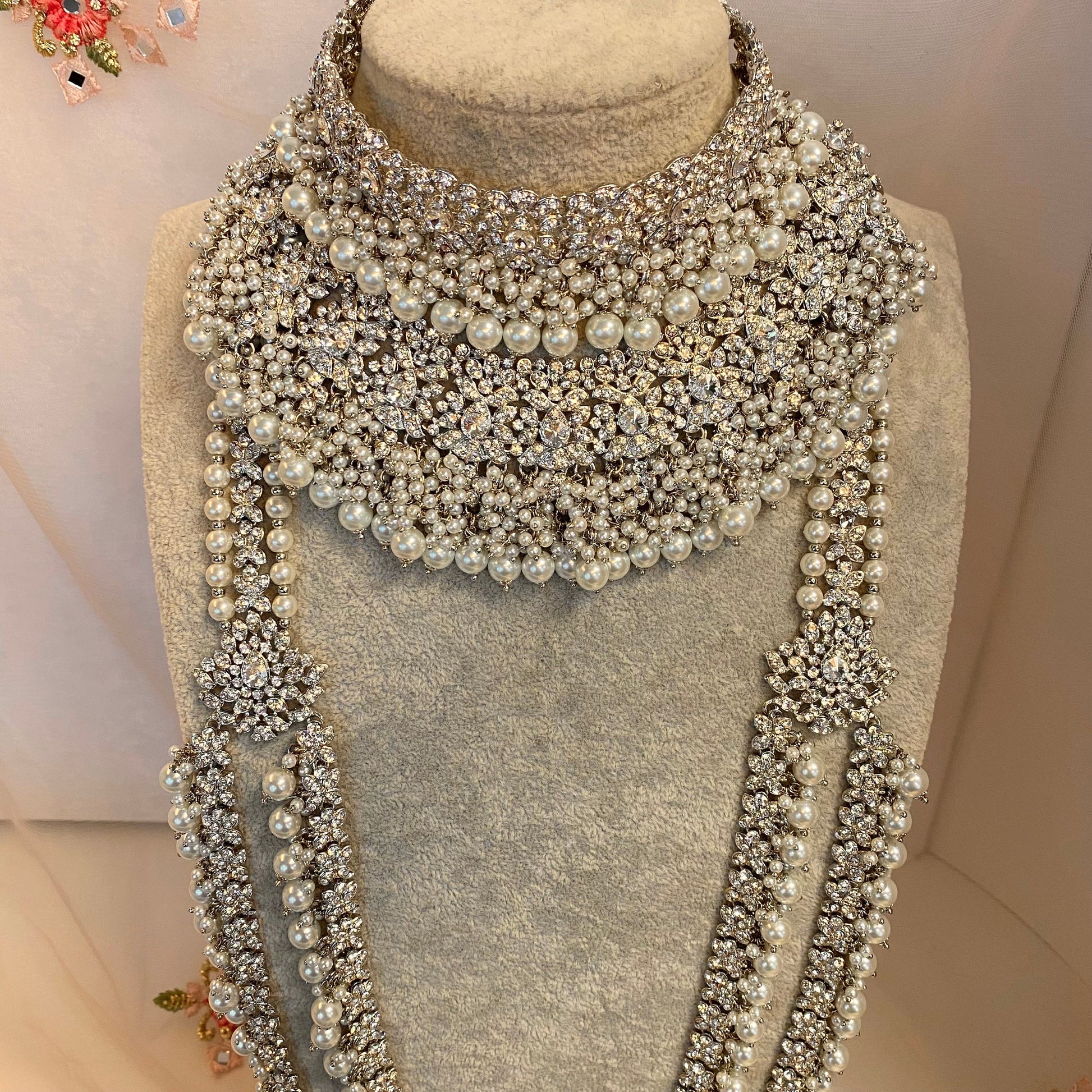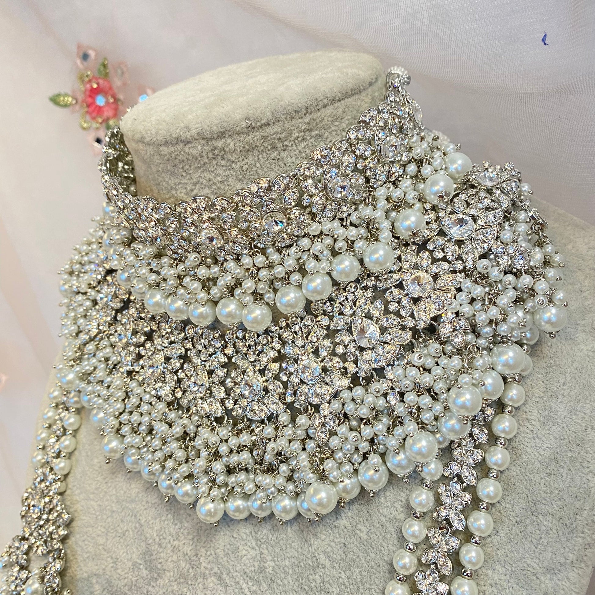 This beautiful silver and sparkling silver crystal bridal set includes Choker, Necklace, Long haar, Jhumka Earrings with Attached Ear Chains, Jhumar, Slide Type Nose Ring and 2 Hand Harness.