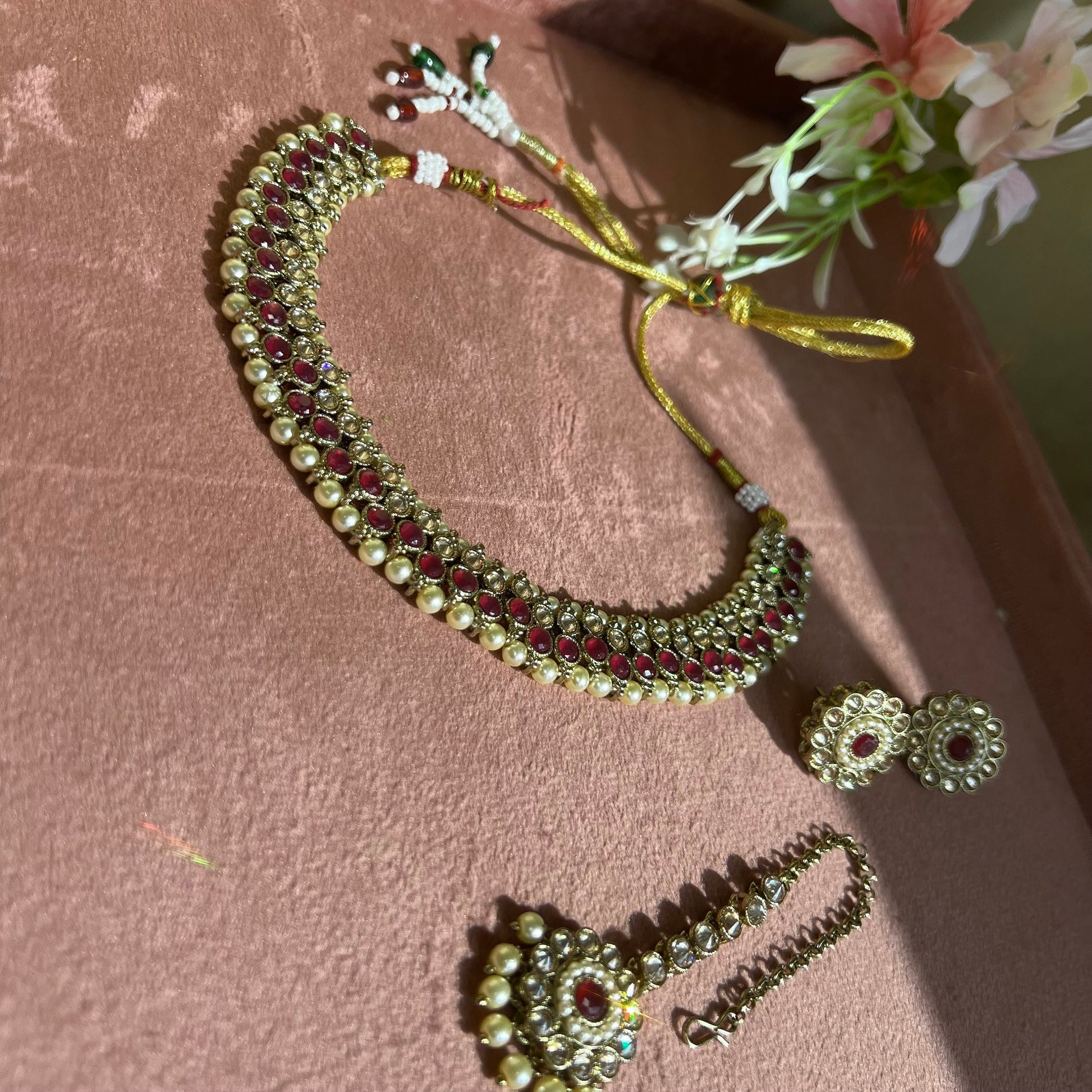 Slim gold necklace set complete with tikka and stud earring . Dark Purple