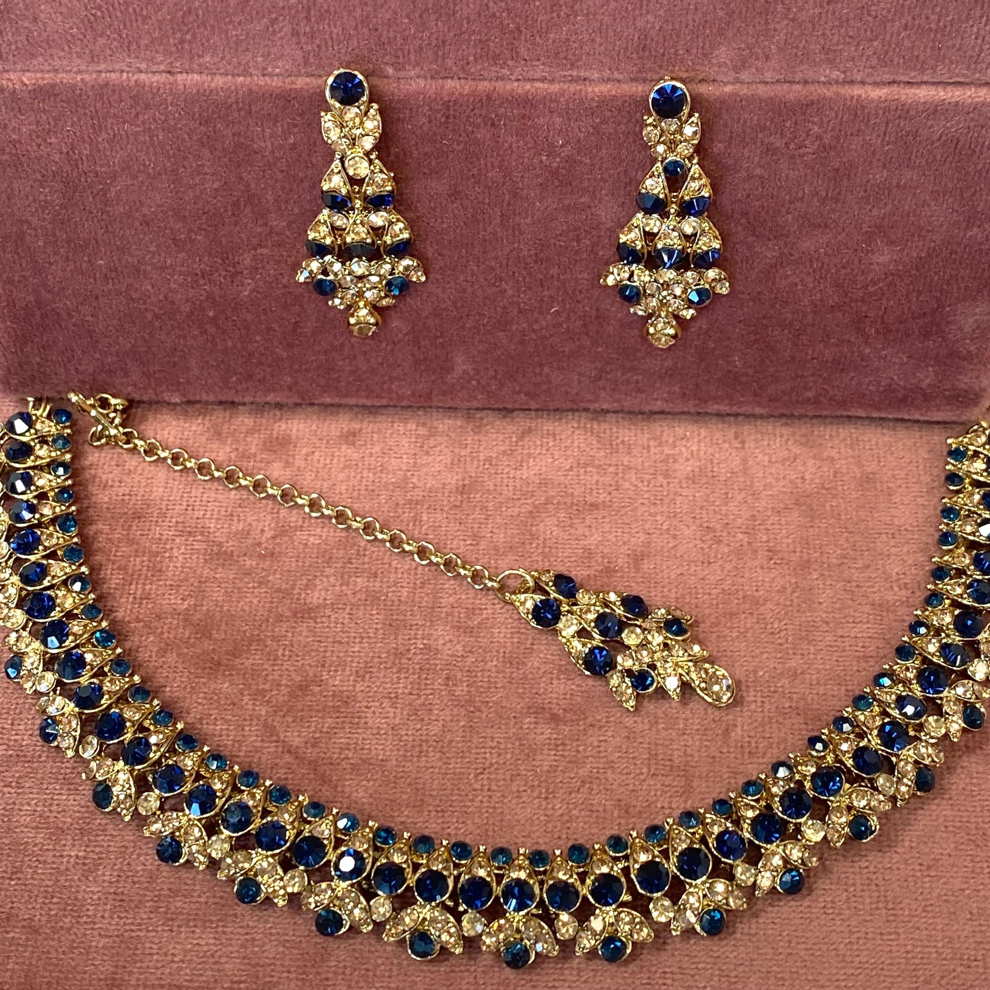 Simple but elegant necklace set with the cutest earring and tikka. Antique gold with navy and golden stones