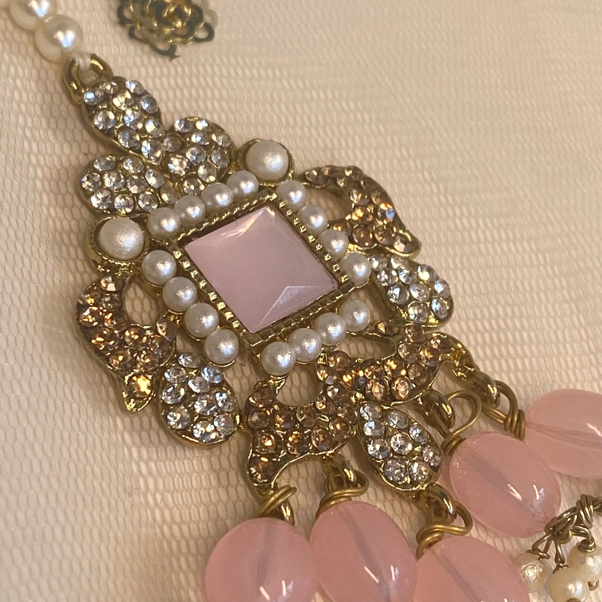 Stylish pink tikka only adorned with sparkling golden and silver rhinestones and pink beads, pearl detail.