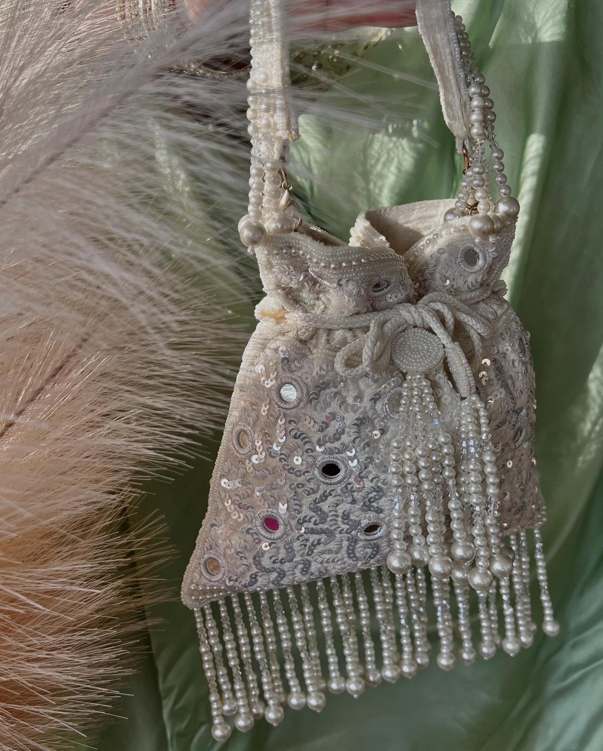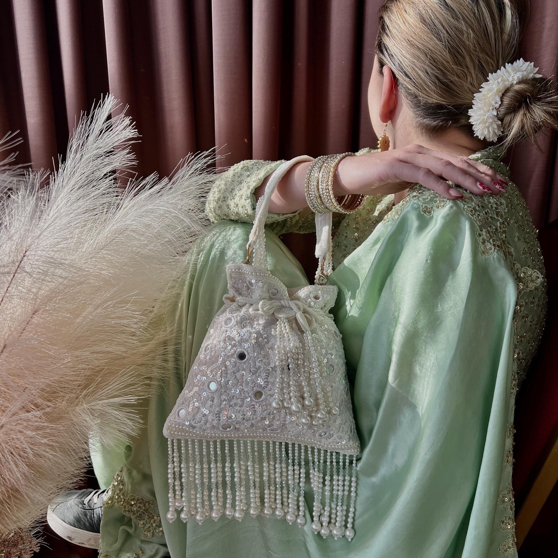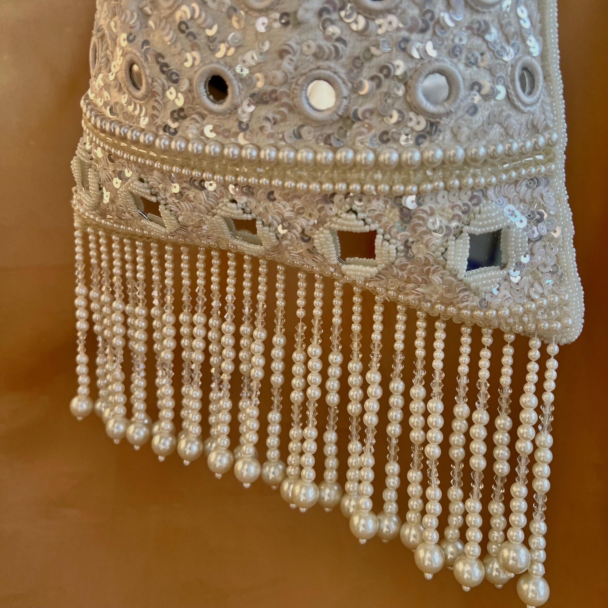 This gorgeous white mirror beaded tasselled with pearl & sequin details bag is a perfect accessory to add to your Indian outfit!