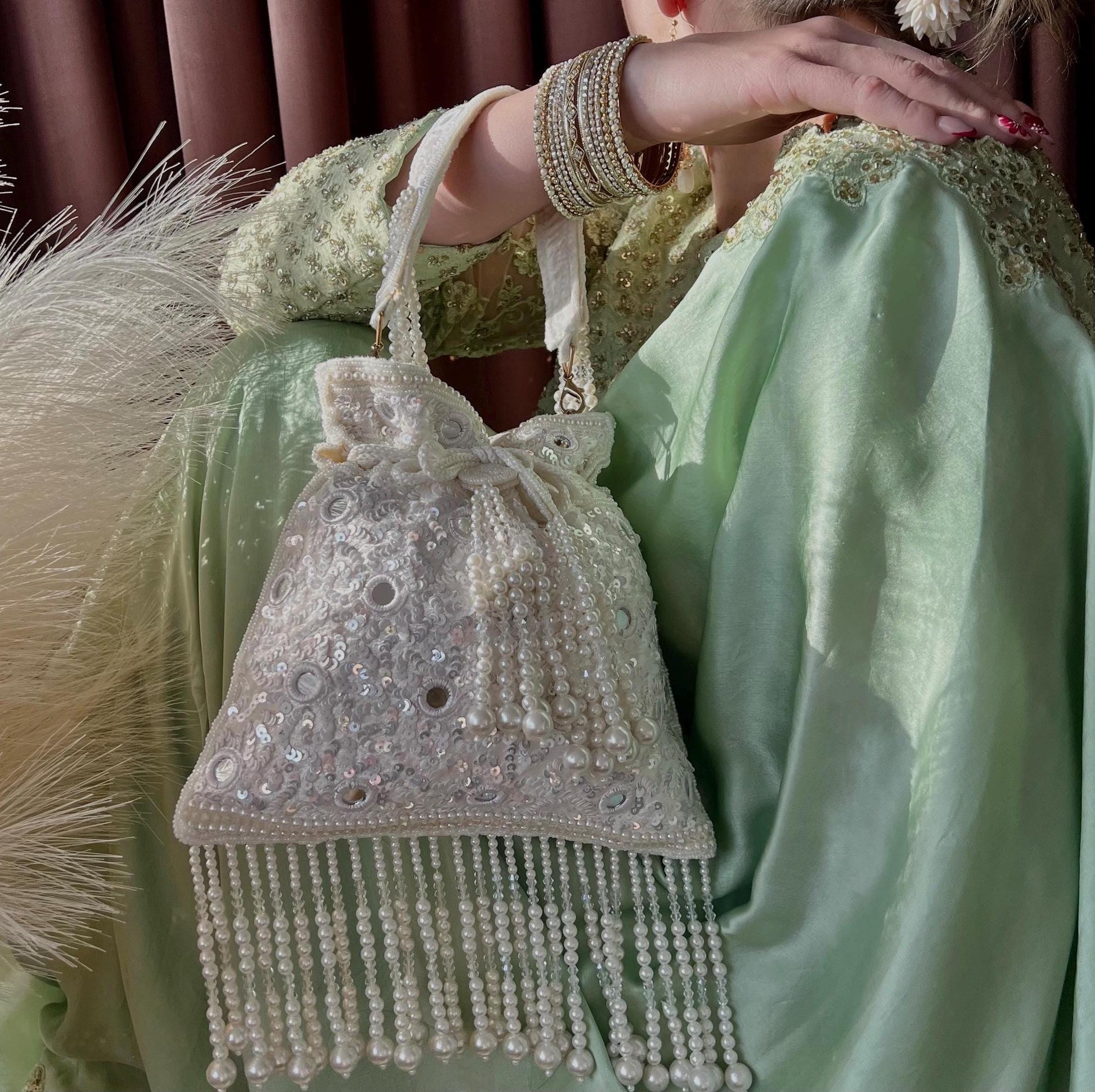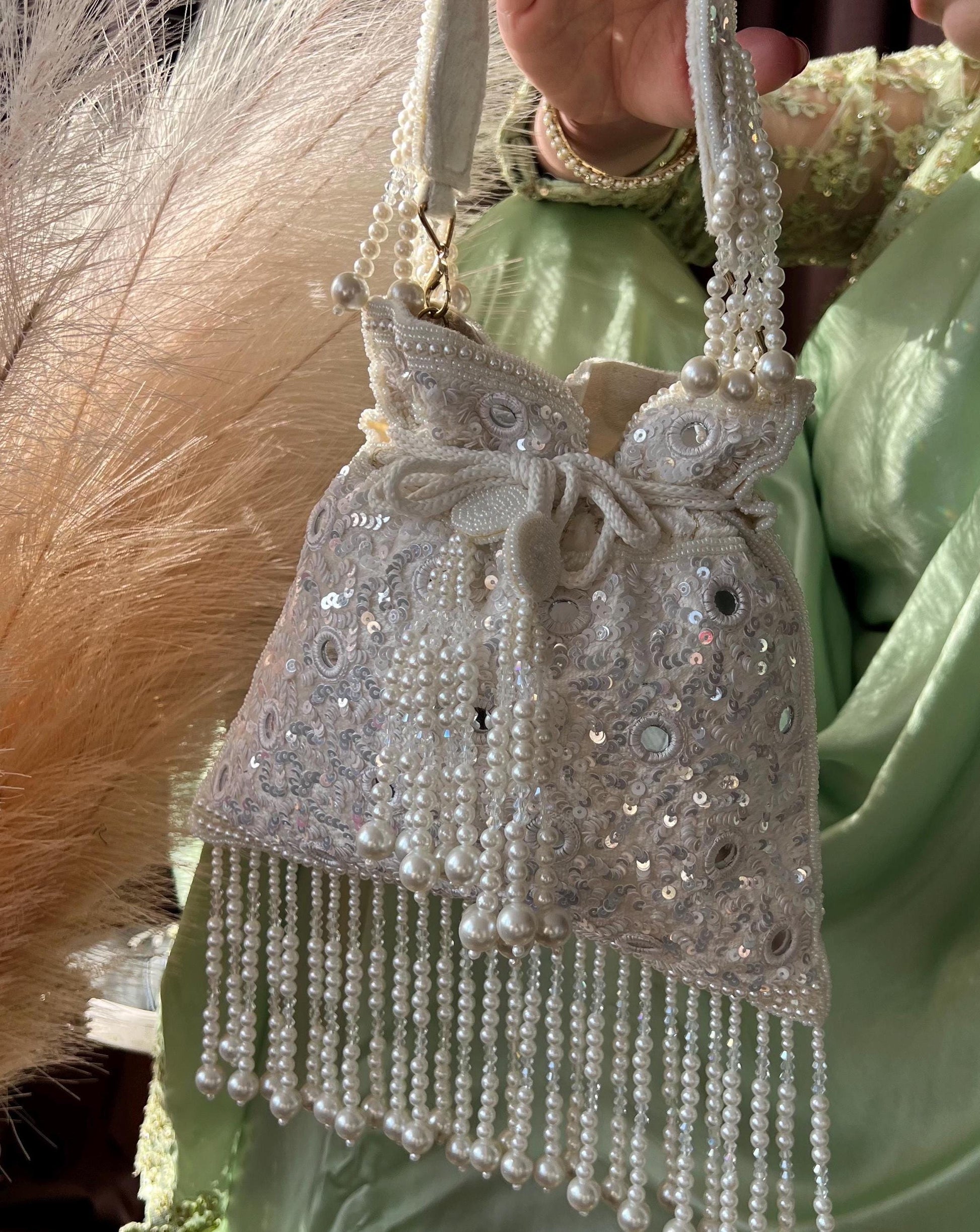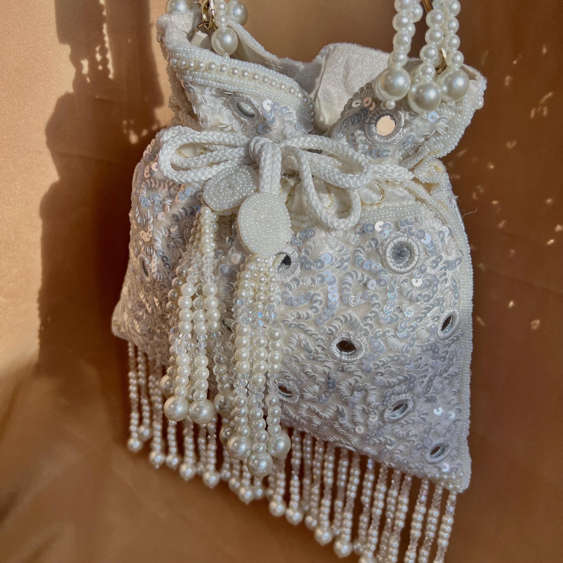 This gorgeous white mirror beaded tasselled with pearl & sequin details bag is a perfect accessory to add to your Indian outfit!